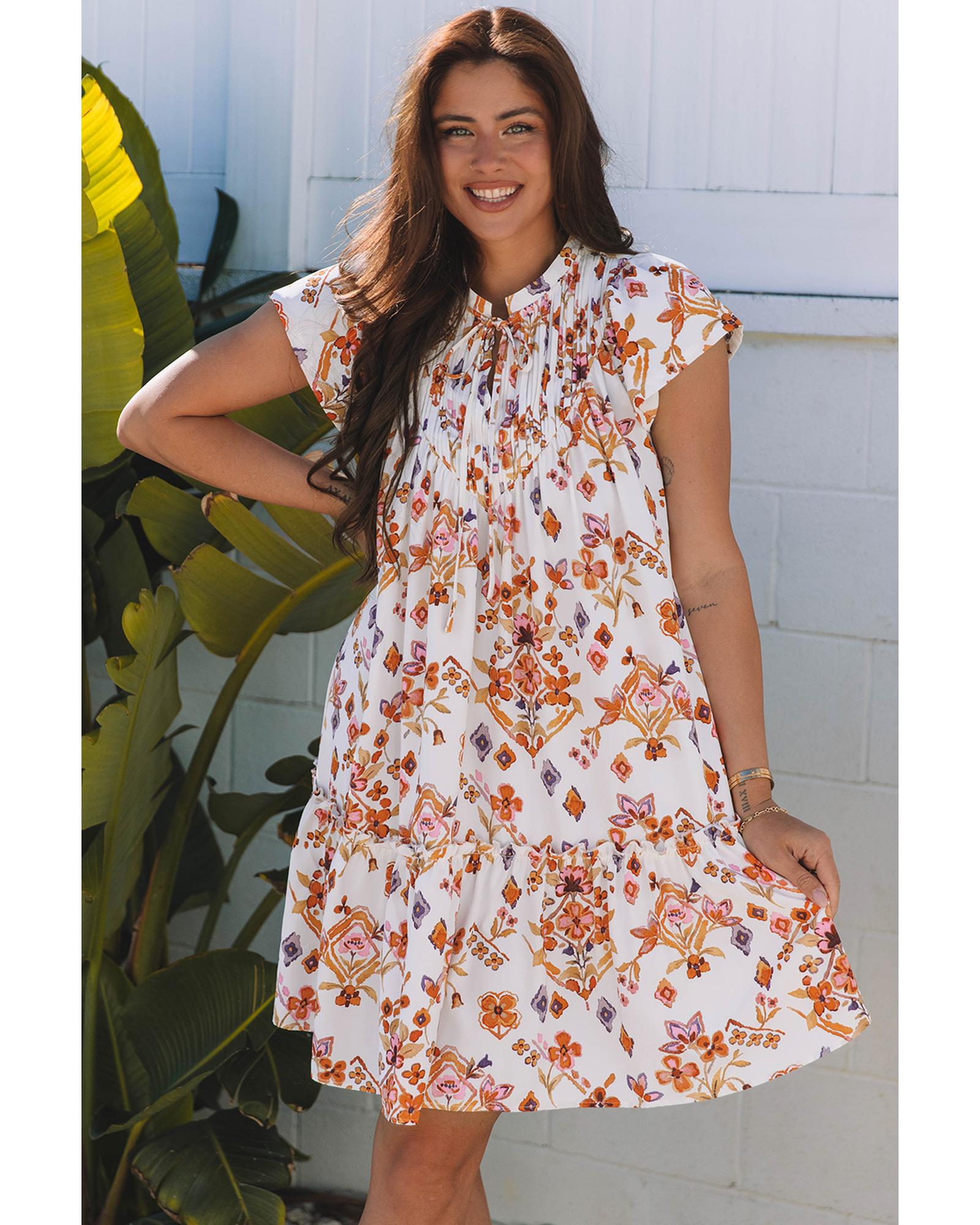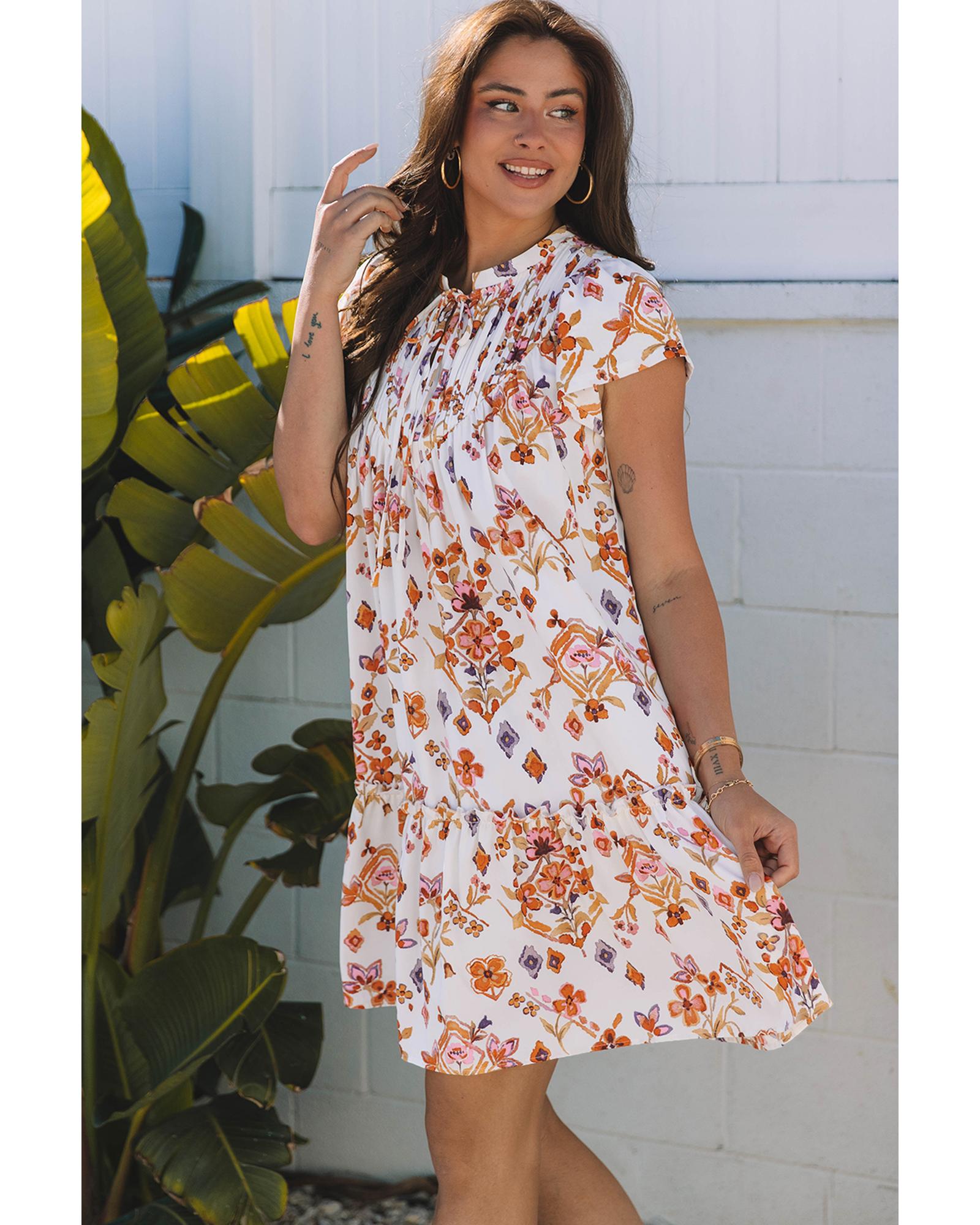 This mini dress features a stylish floral and geometric print, perfect for creating a trendy and eye-catching look. The delicate ruffled trim adds a playful detail, while the flutter sleeves enhance its feminine and flirty appeal. It can be paired with heels or sandals to achieve a charming and fashionable vibe.
