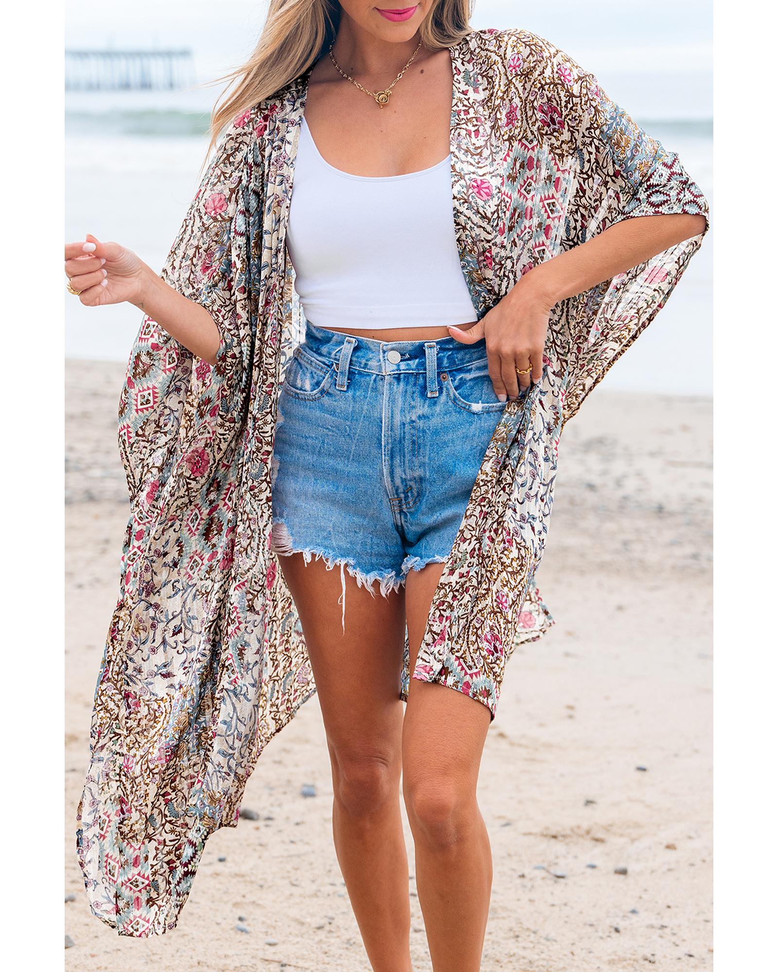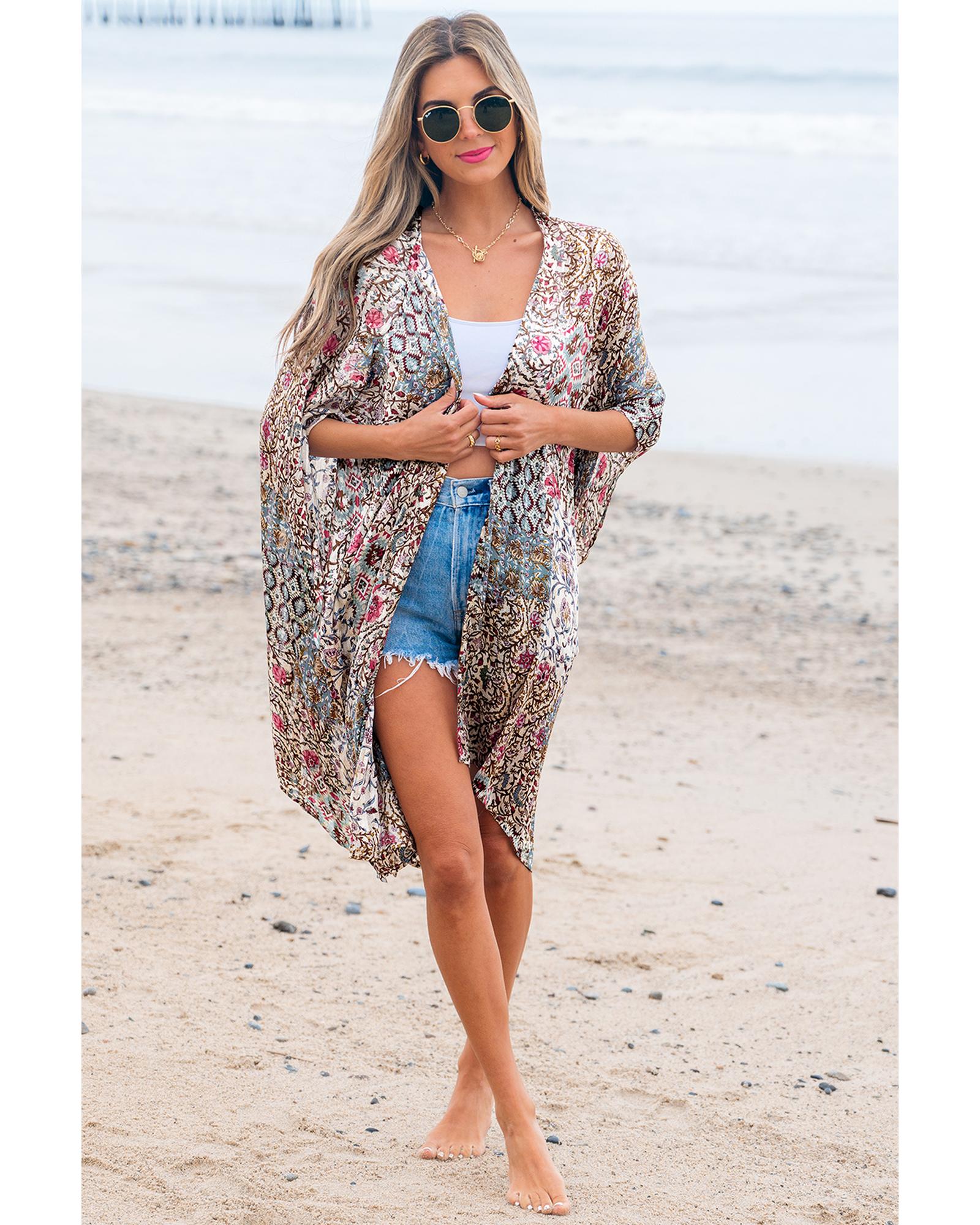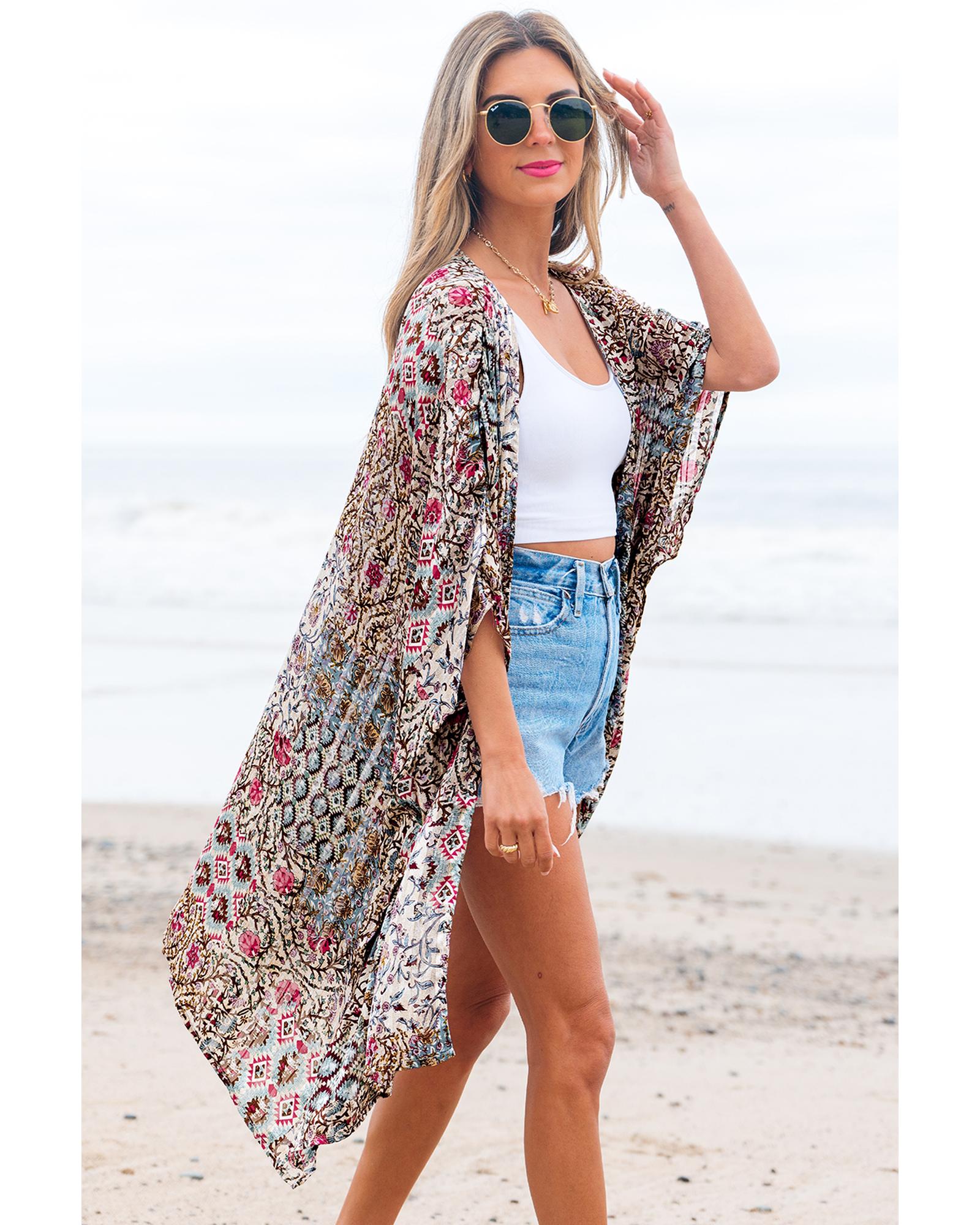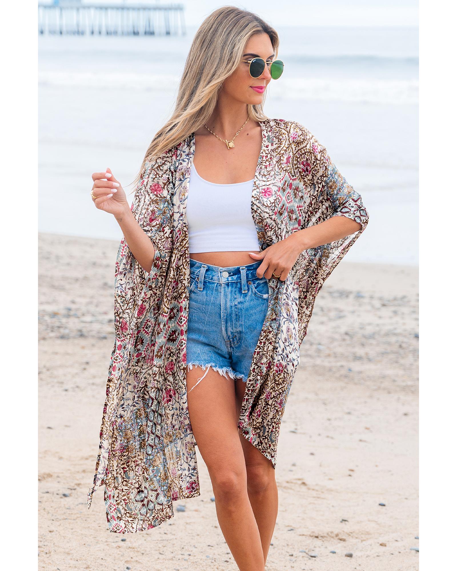 This apricot floral print kimono offers a fresh and stylish appearance, perfect for casual or semi-formal occasions. Its wide sleeves and open front design provide a relaxed and versatile look, while the tunic length adds a flattering silhouette. Made from lightweight polyester, it ensures comfort and ease of wear.