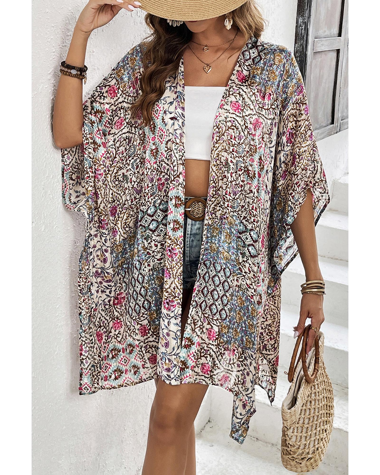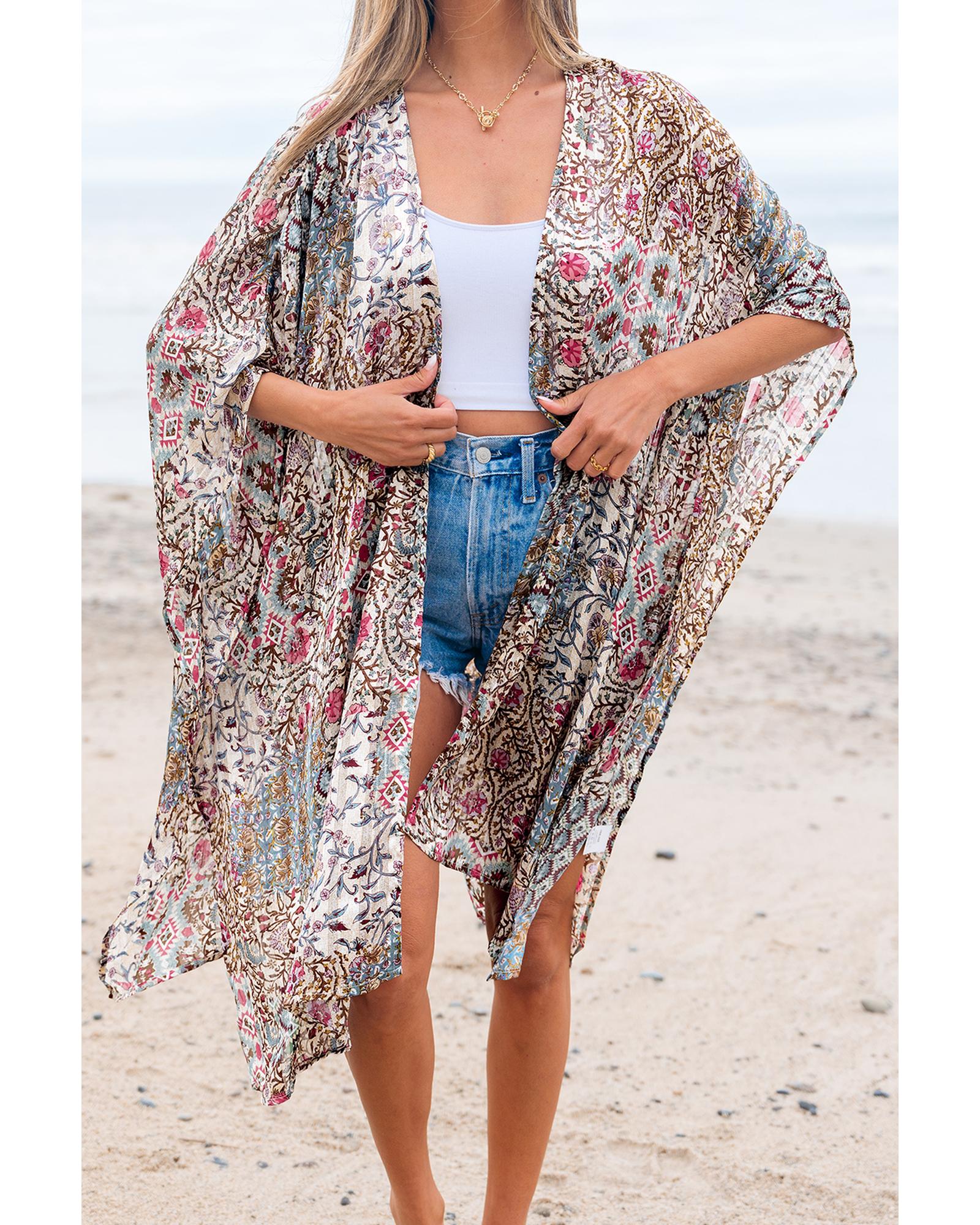 Apricot Floral Print Short Wide Sleeve Open Front Loose Kimono – One Size