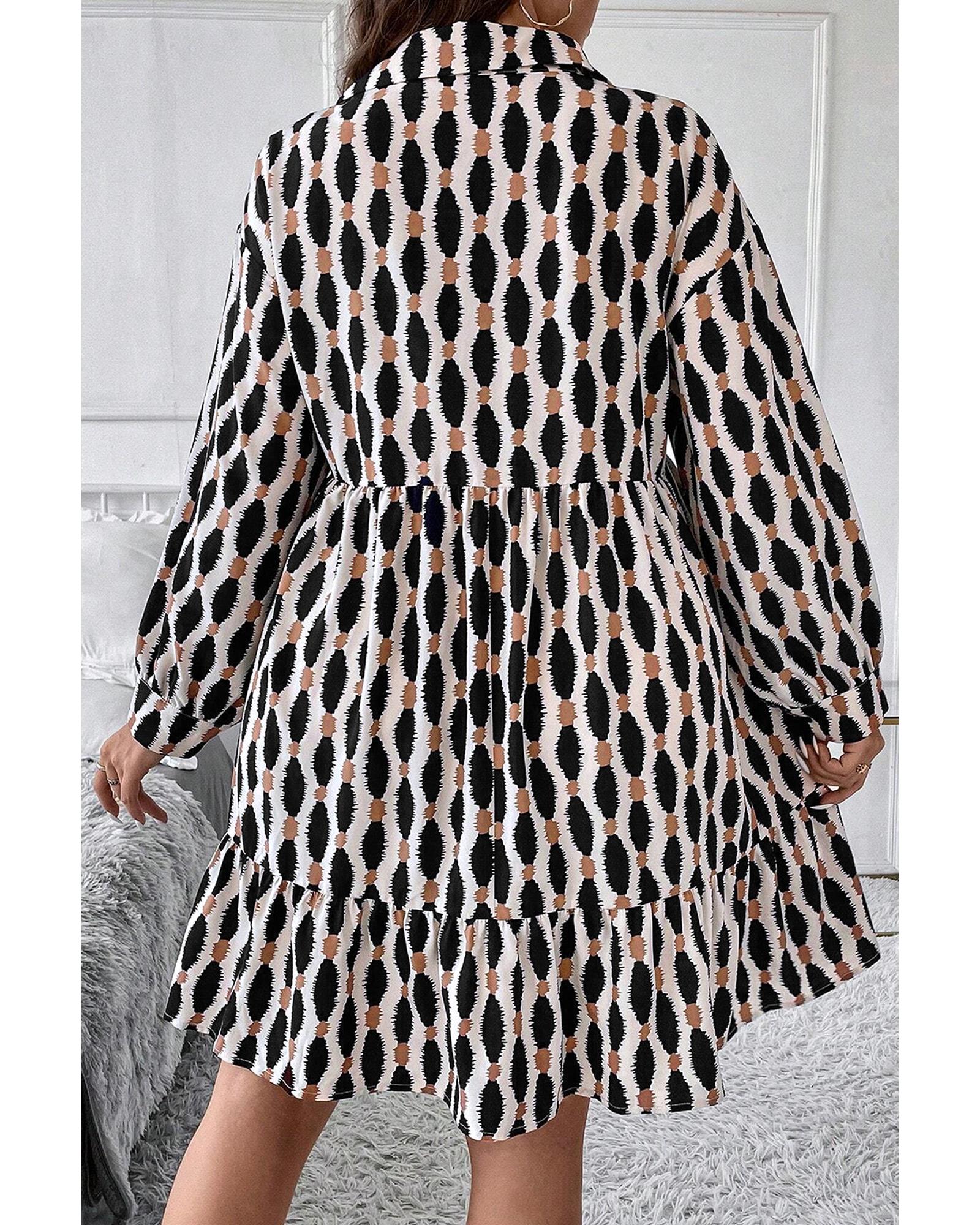 This plus size mini dress features a trendy geometric print and a chic collared V-neck design, offering a stylish and comfortable option for various occasions. Made from soft, lightweight material, it ensures a flattering fit and confident wear.
