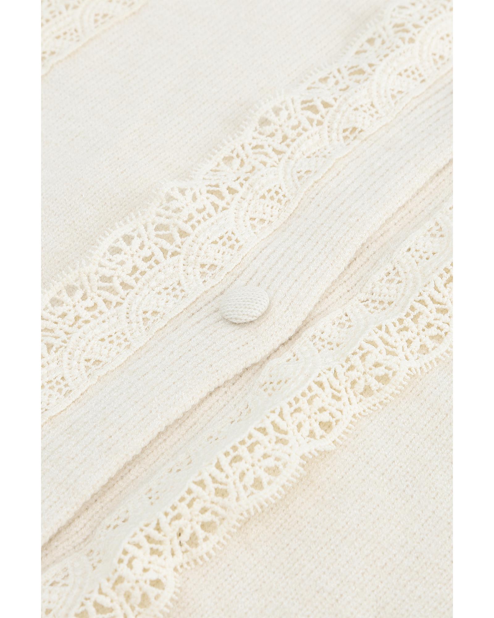 This cardigan features a ribbed knit design combined with delicate lace splicing, creating a cozy and stylish appearance. Its versatile style makes it suitable for various occasions, offering both comfort and feminine charm. The sleeves provide ample coverage and can be rolled up or down, making it adaptable to different looks and weather conditions.