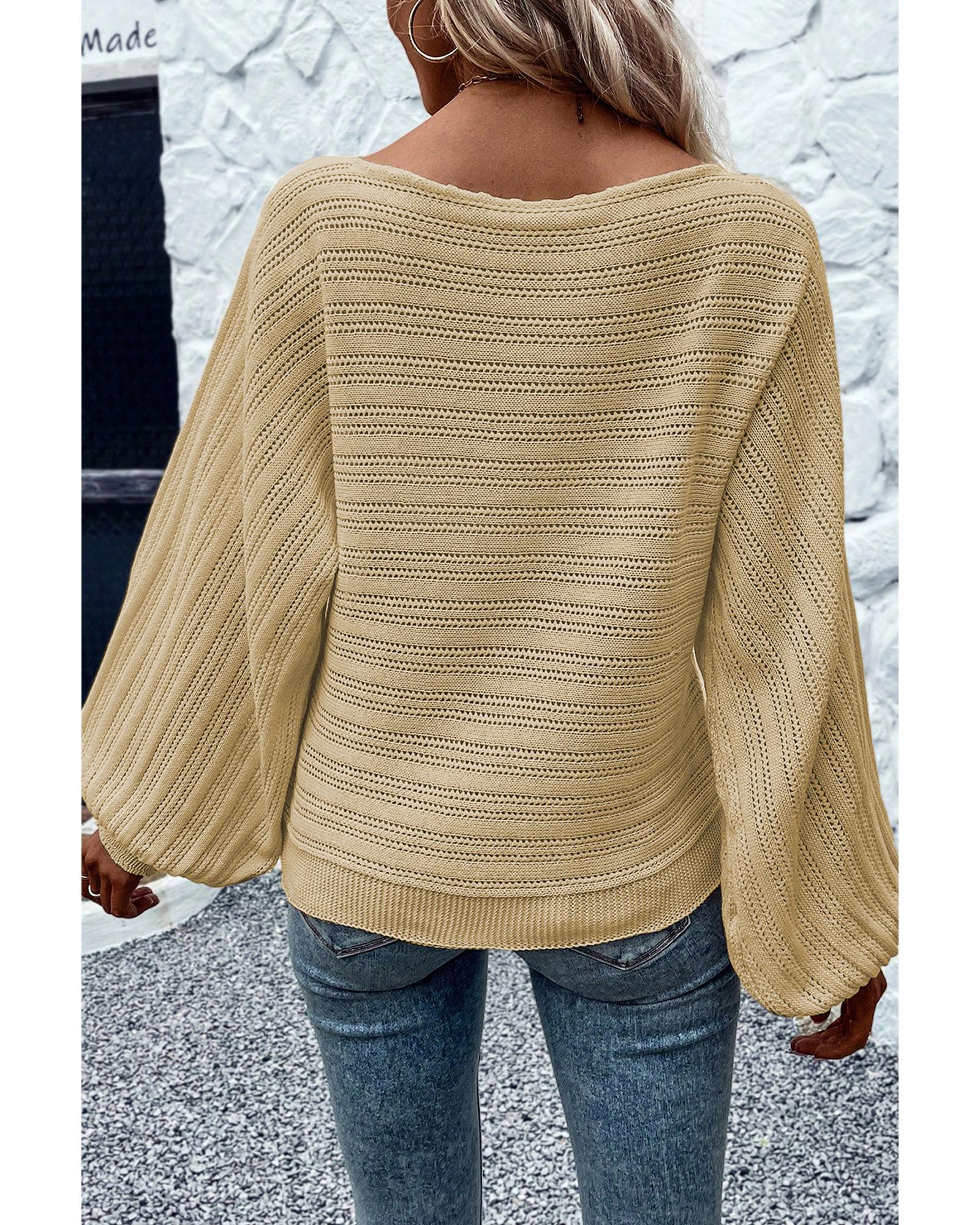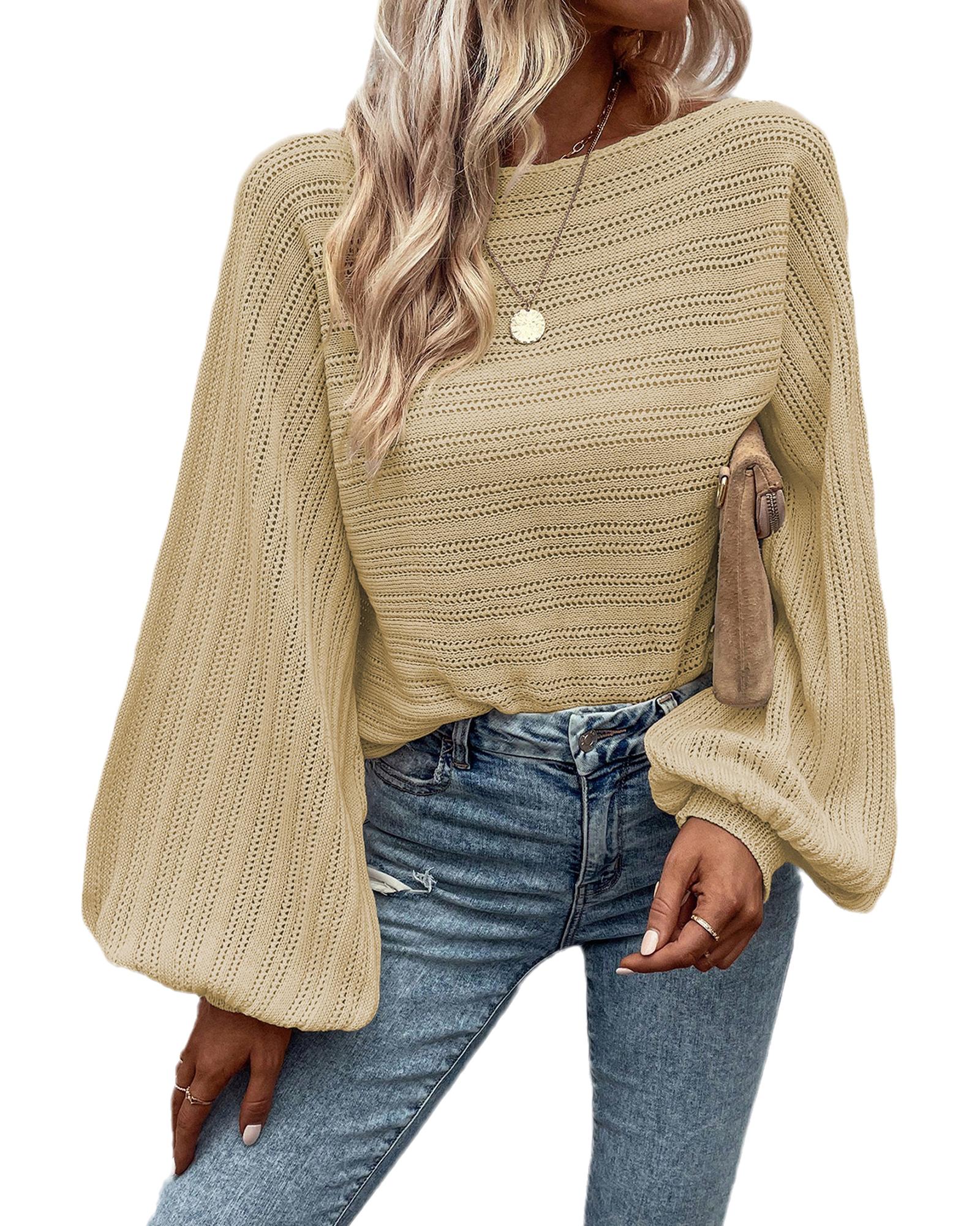 This textured knit sweater features a stylish eyelets pattern and elegant lantern sleeves, offering a trendy fitted look suitable for various occasions. Crafted from high-quality fabric, it combines comfort with a fashionable design, making it a versatile addition to your wardrobe.