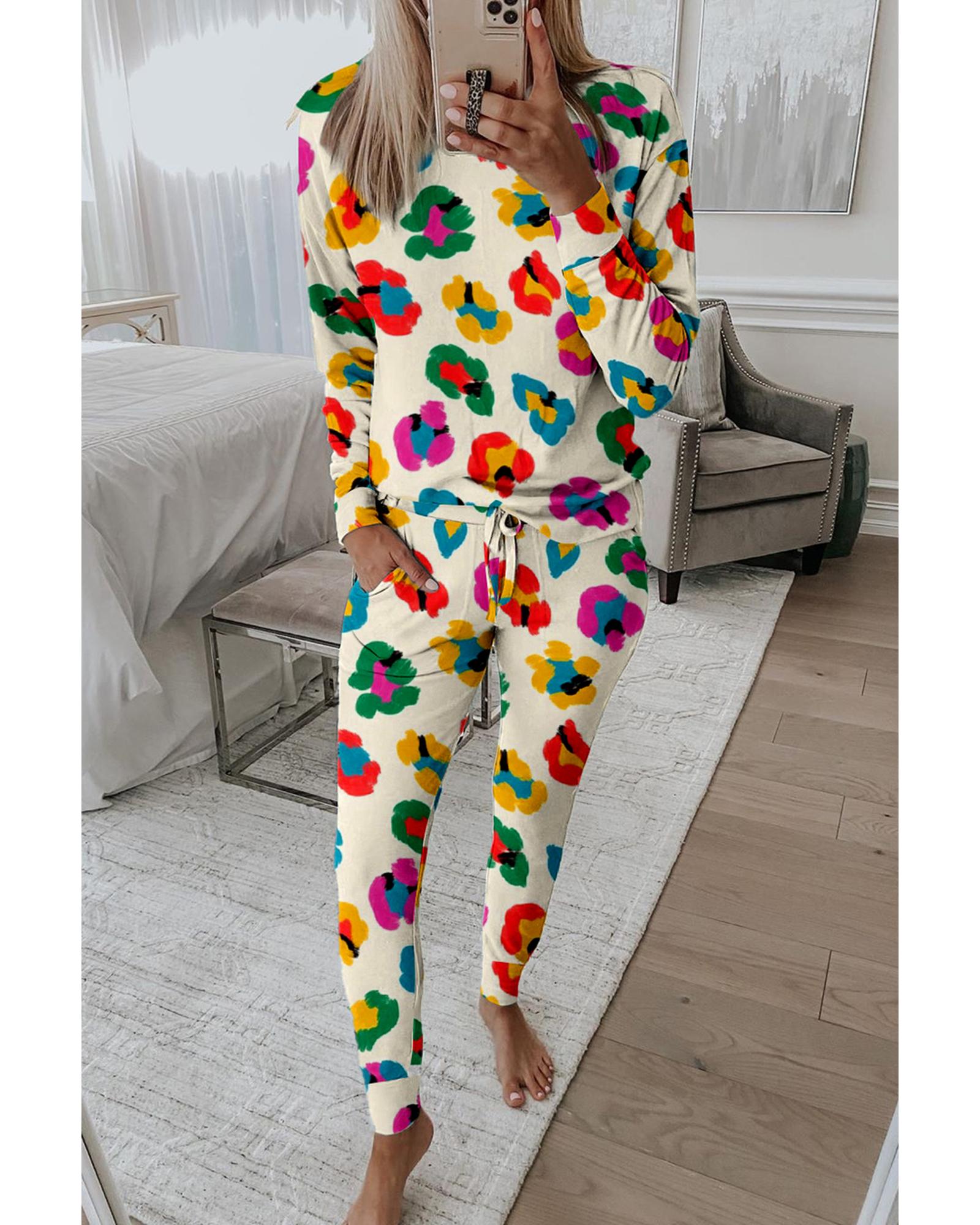 Apricot Leopard Print Long Sleeve Top and Skinny Pants Lounge Set – S