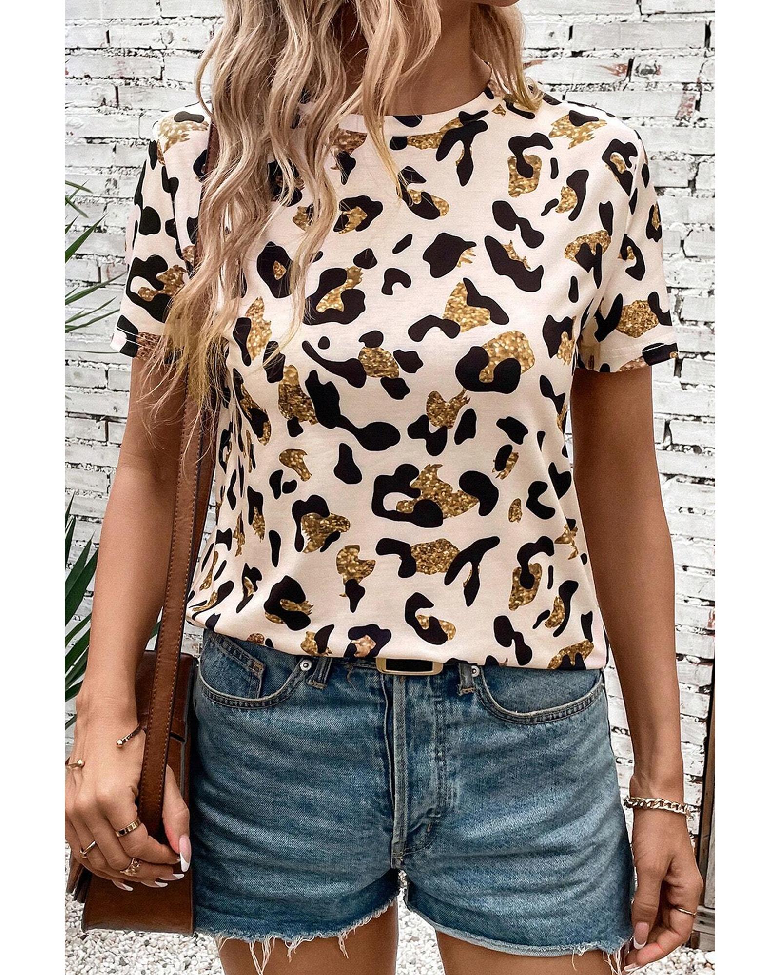 This casual T-shirt features a classic round neck design combined with a bold leopard print pattern, making it a stylish choice for everyday wear. The short sleeves and regular fit provide a comfortable and flattering silhouette, suitable for warmer weather. Crafted with high elasticity, it ensures ease of movement and all-day comfort.