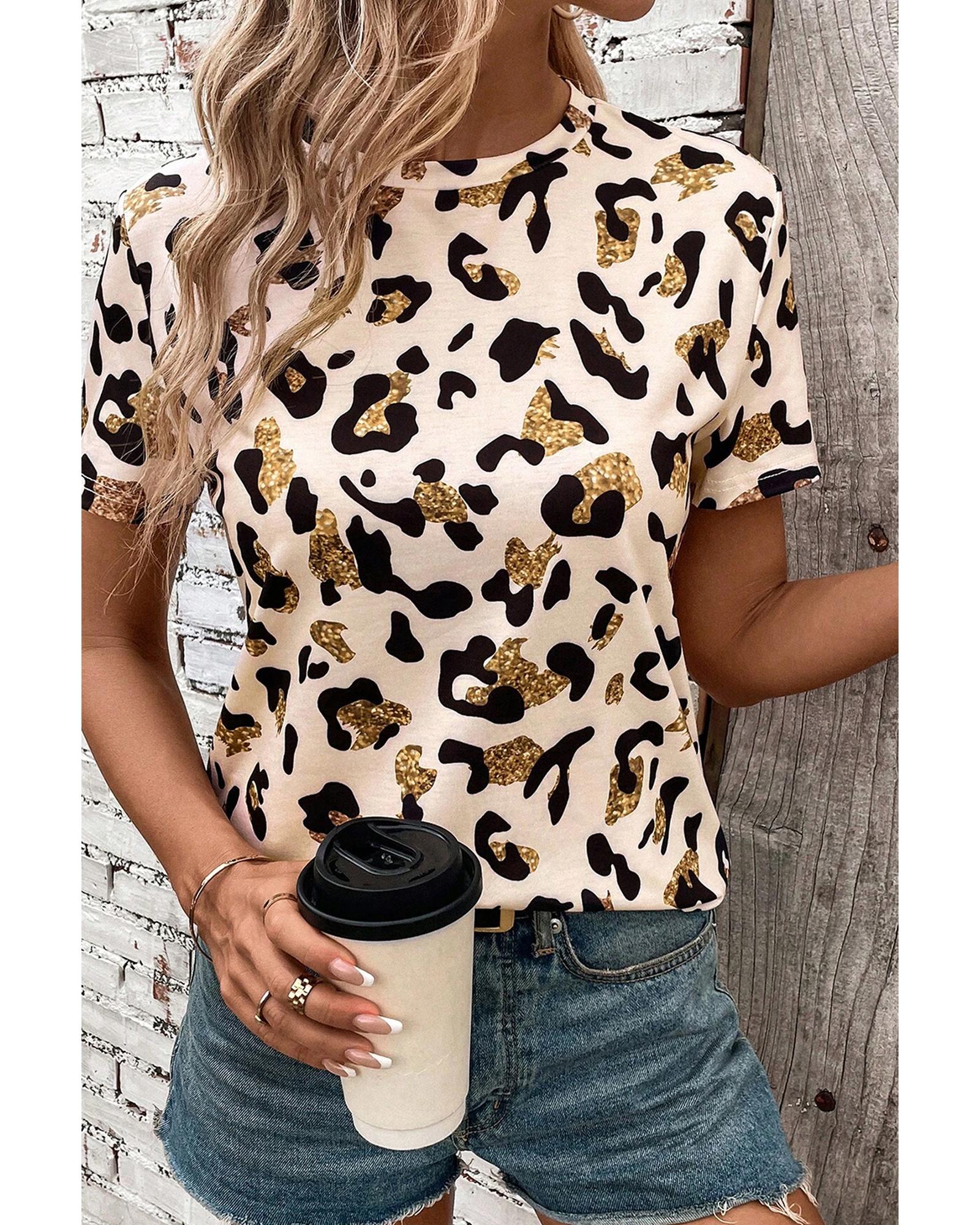Apricot Leopard Print Round Neck Casual T Shirt – M