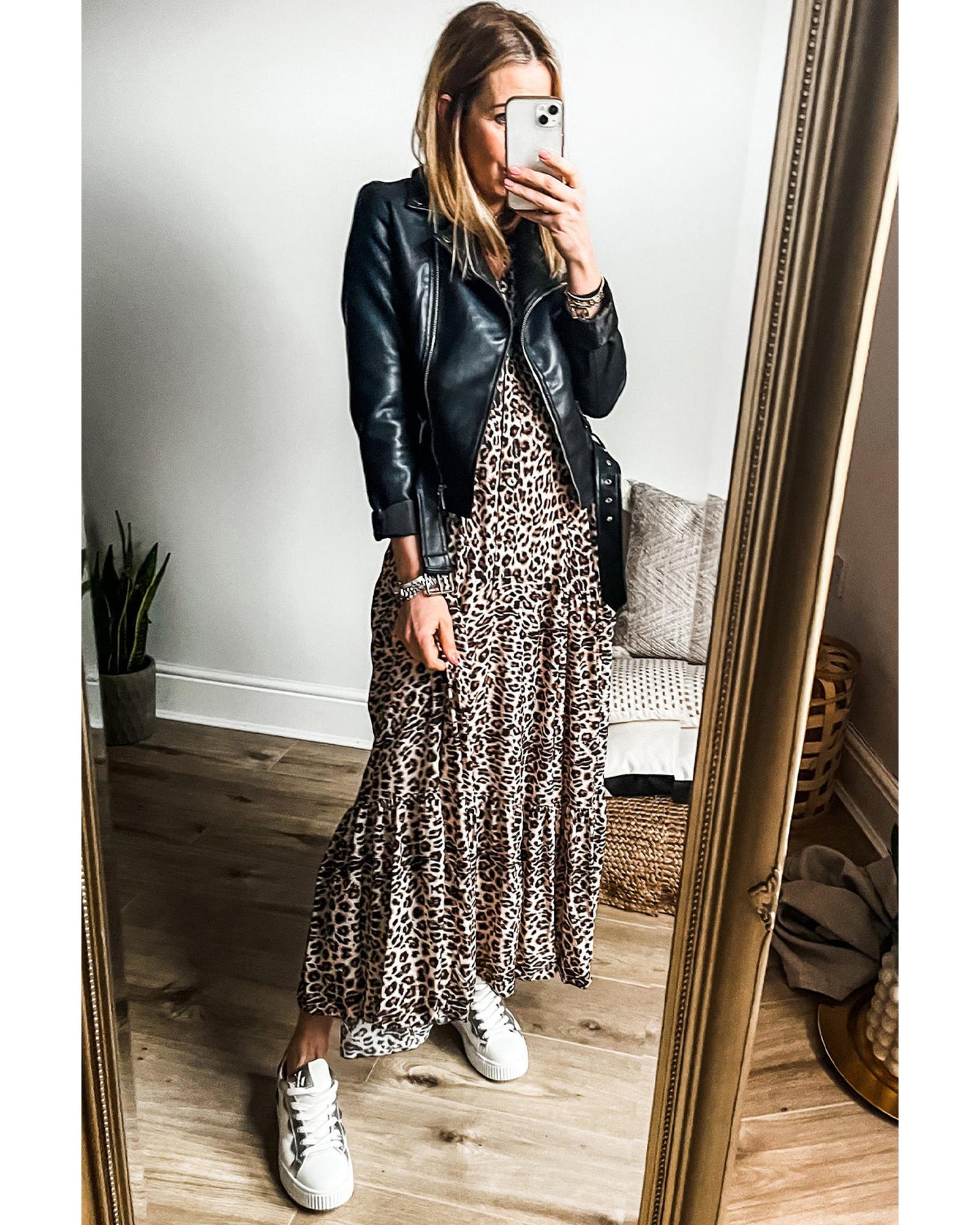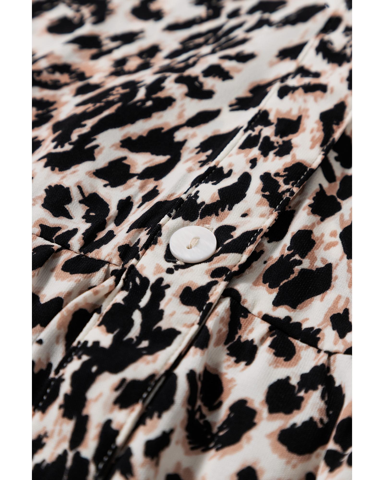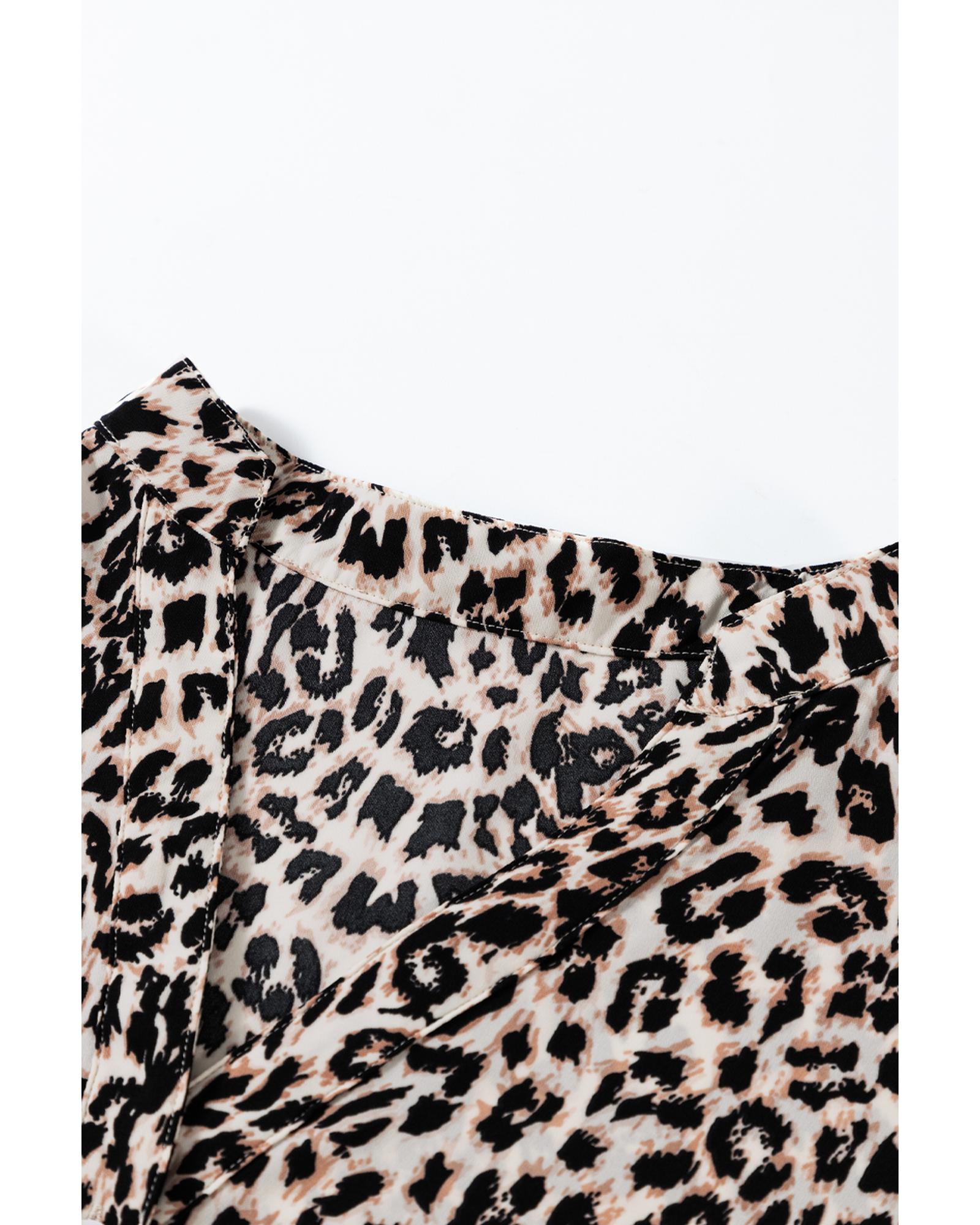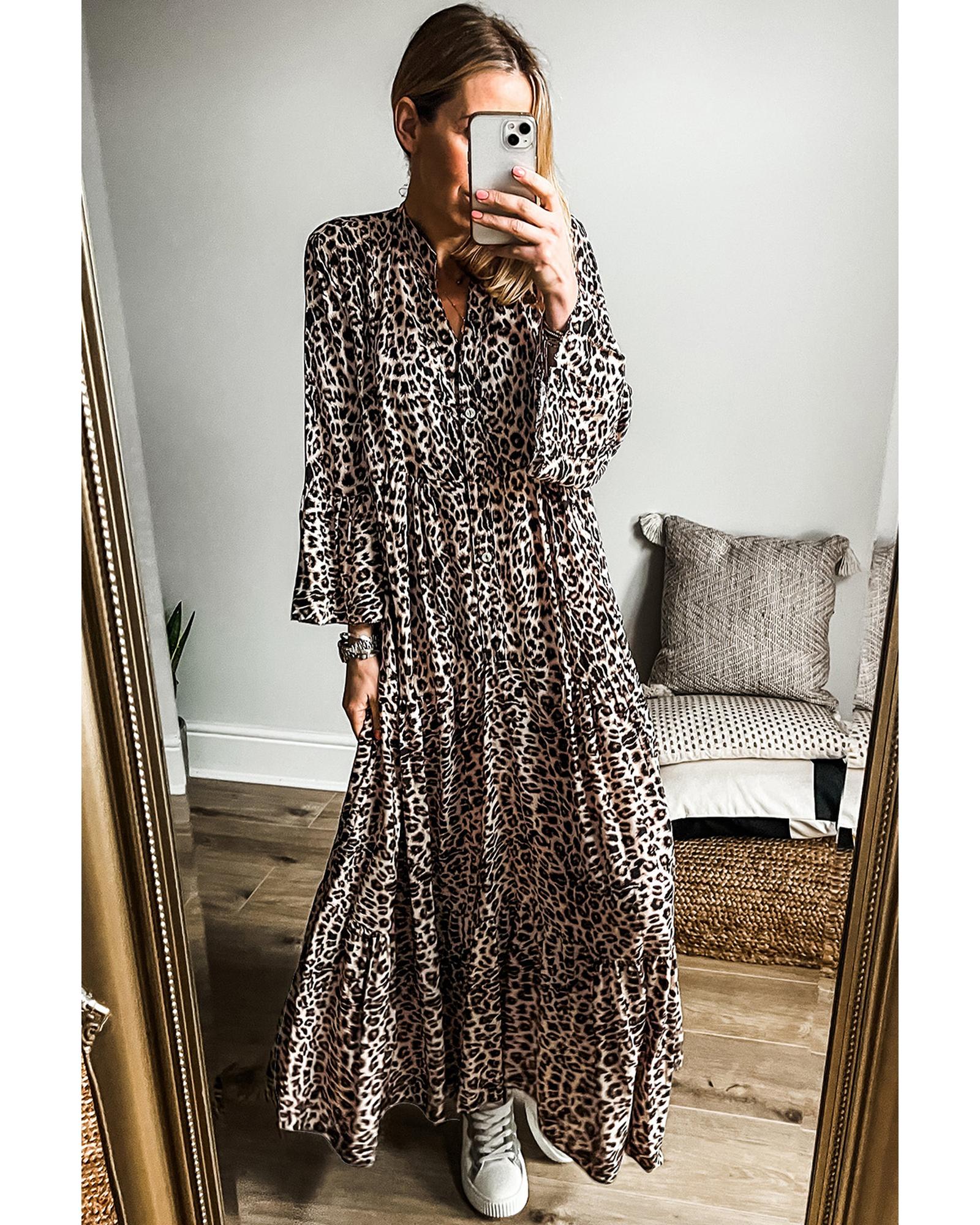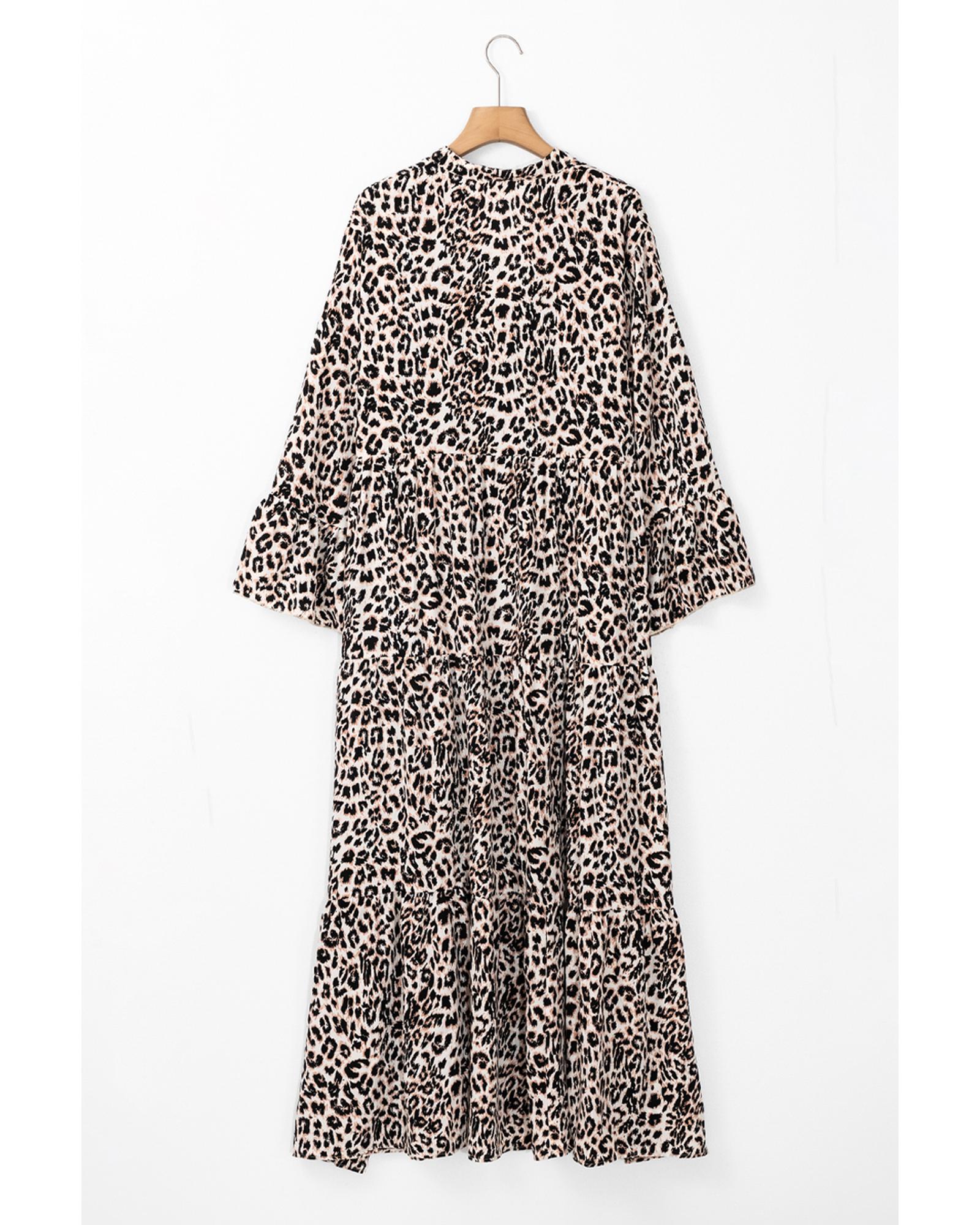 This maxi dress features a trendy leopard print design with a tiered silhouette and wide sleeves, offering a stylish and elegant look suitable for various occasions. The loose fit and lightweight fabric ensure comfort and breathability, making it a versatile addition to your wardrobe.