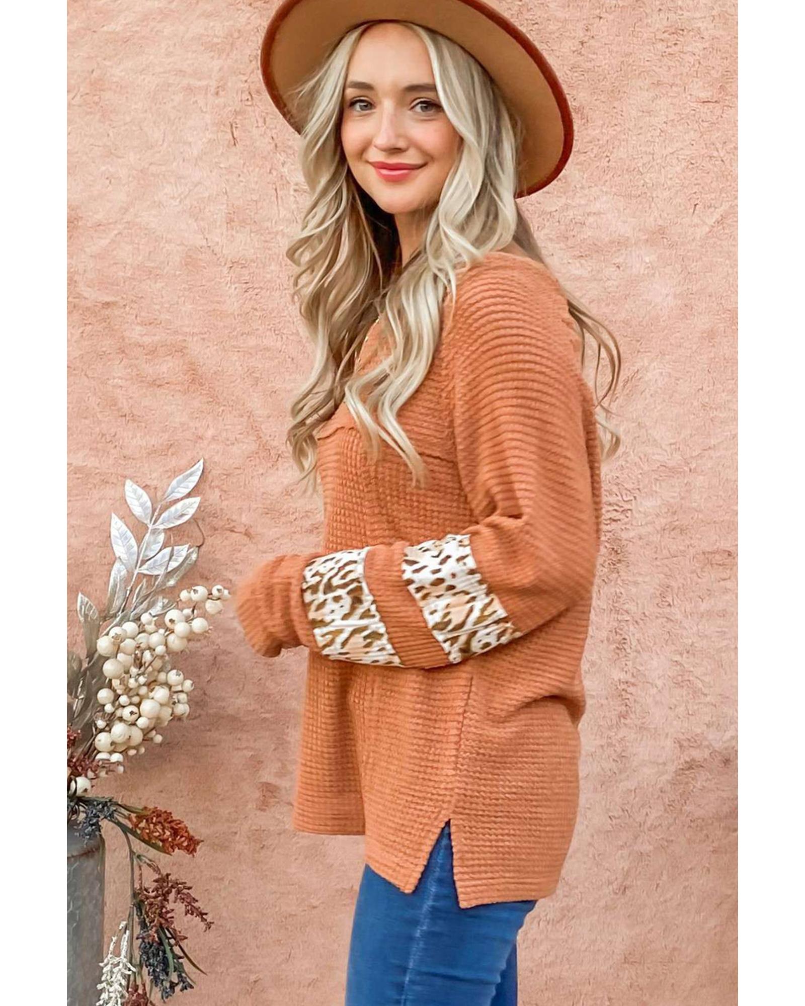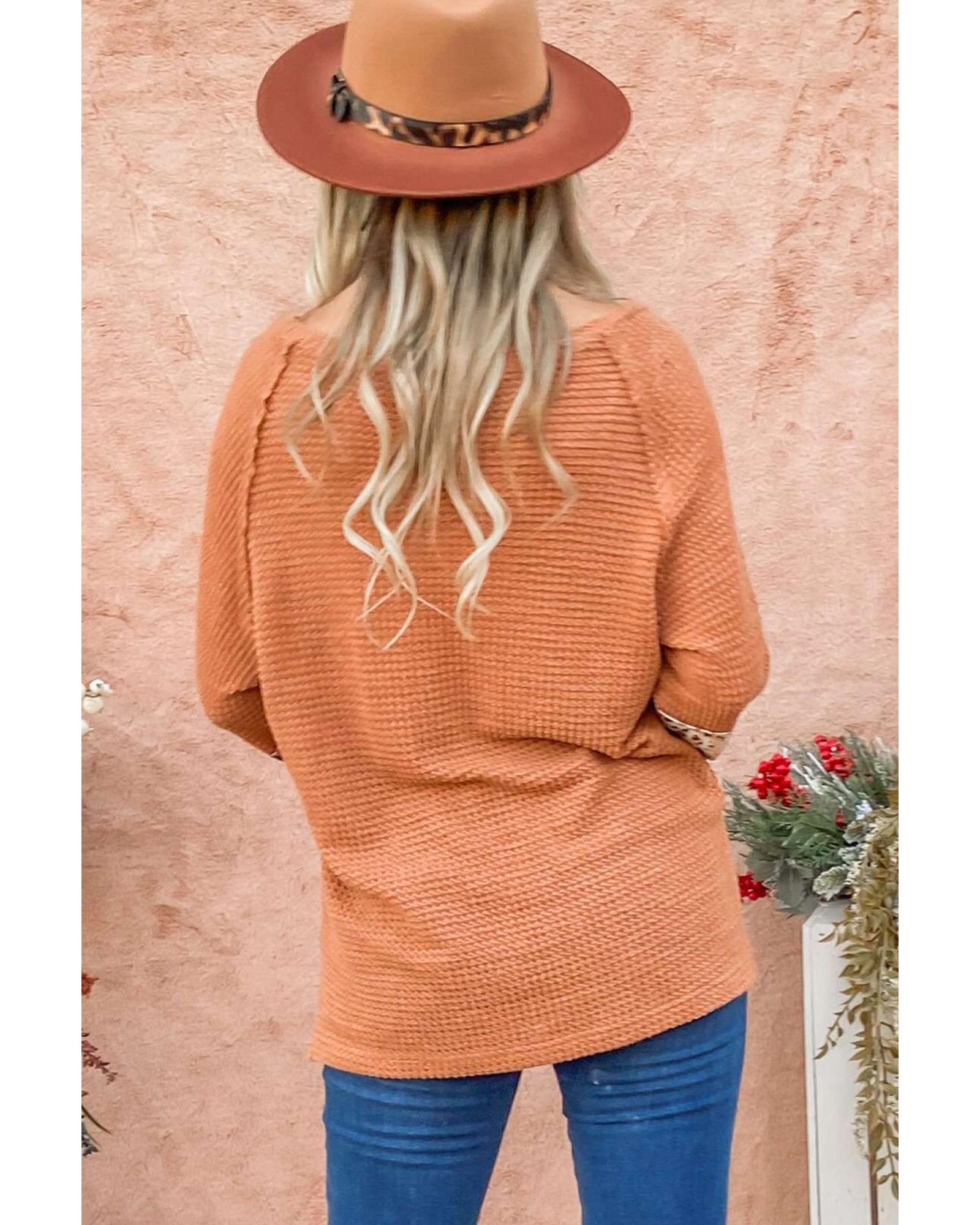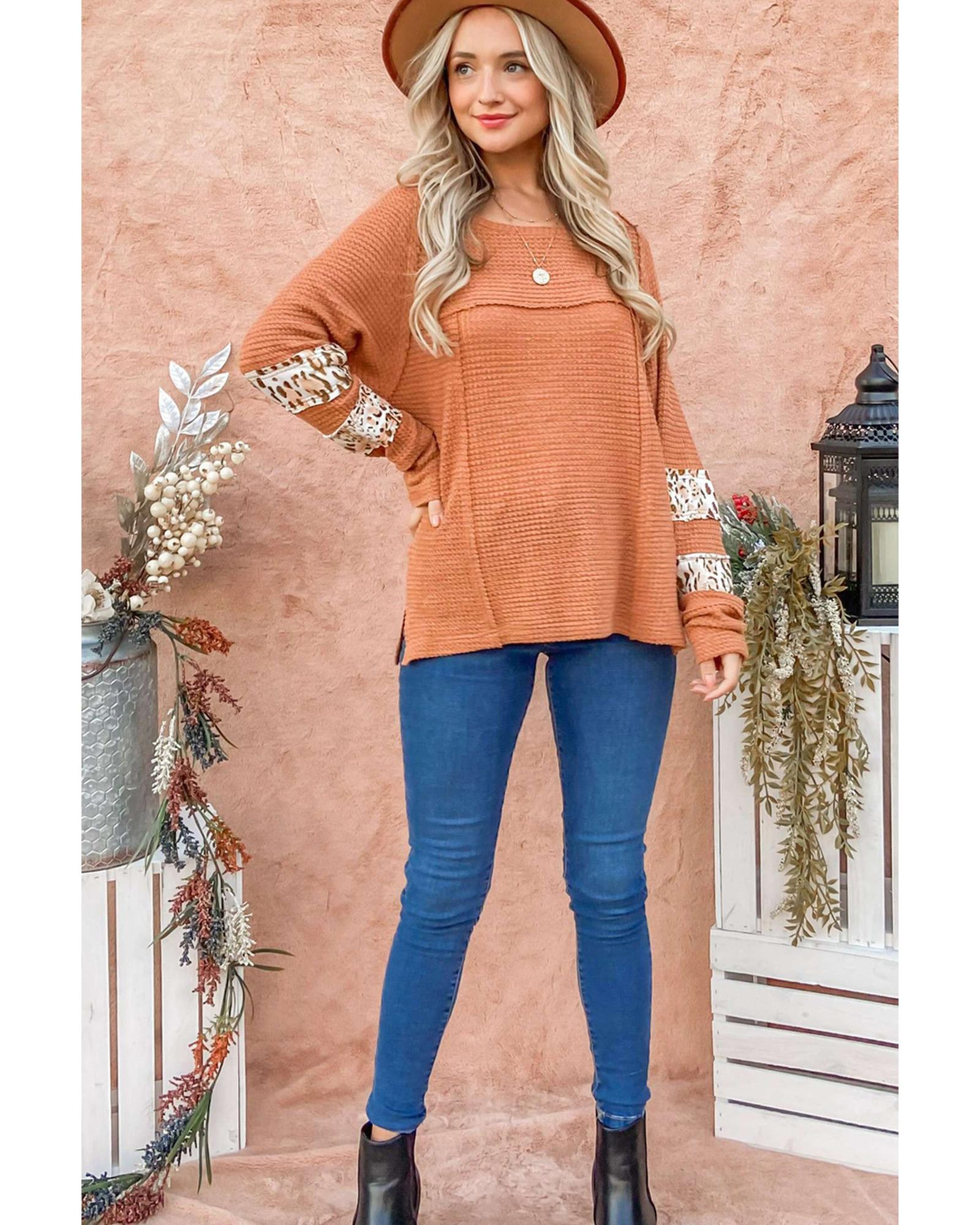 Apricot Leopard Splicing Exposed Seam Waffle Knit Top – M