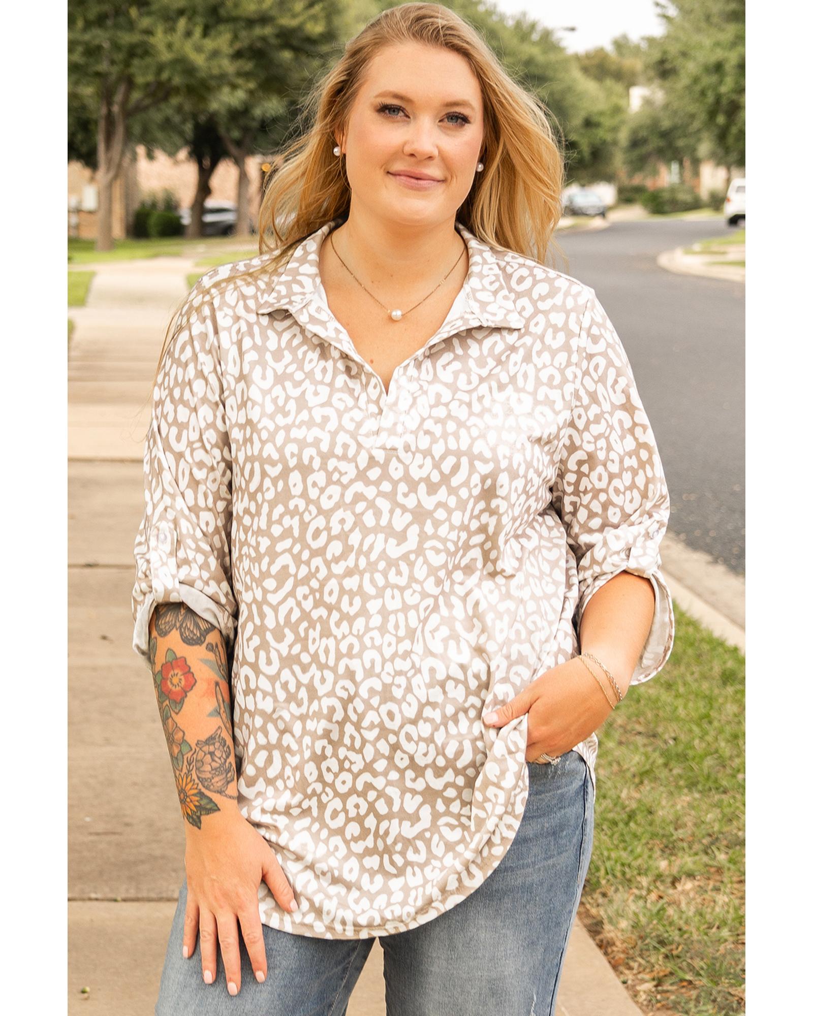 Apricot Leopard Tab Sleeve V Neck Plus Size Top – 2X
