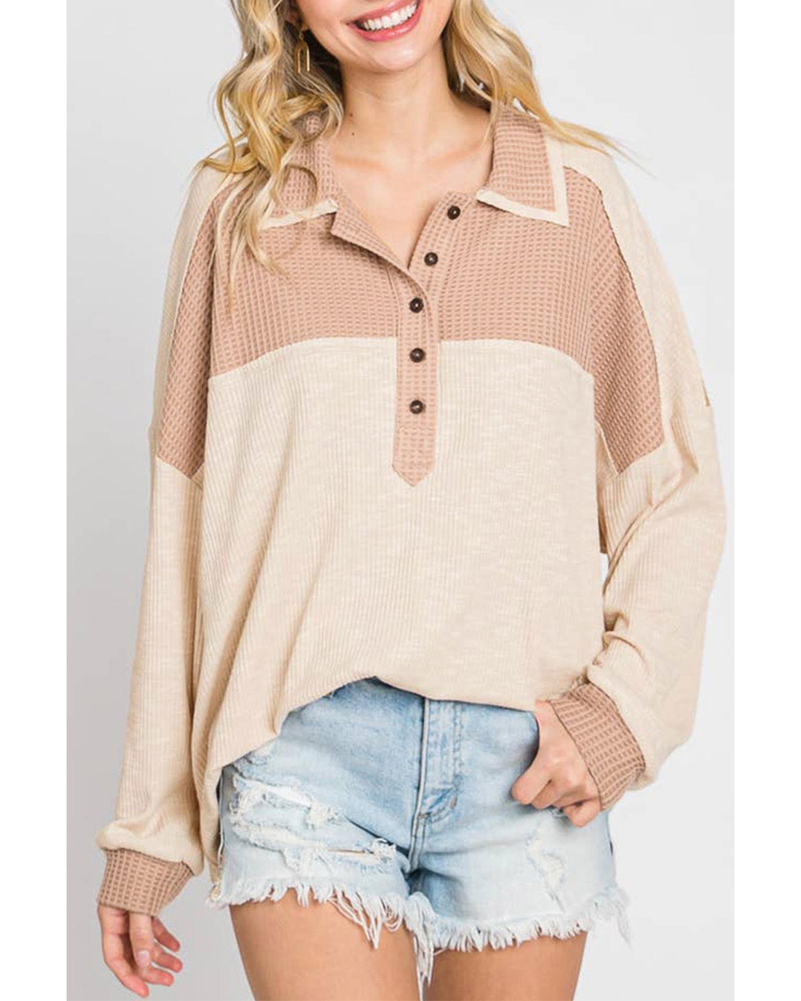 Apricot Leopard Splicing Exposed Seam Waffle Knit Top - M Original price was: $58.99.Current price is: $31.99.