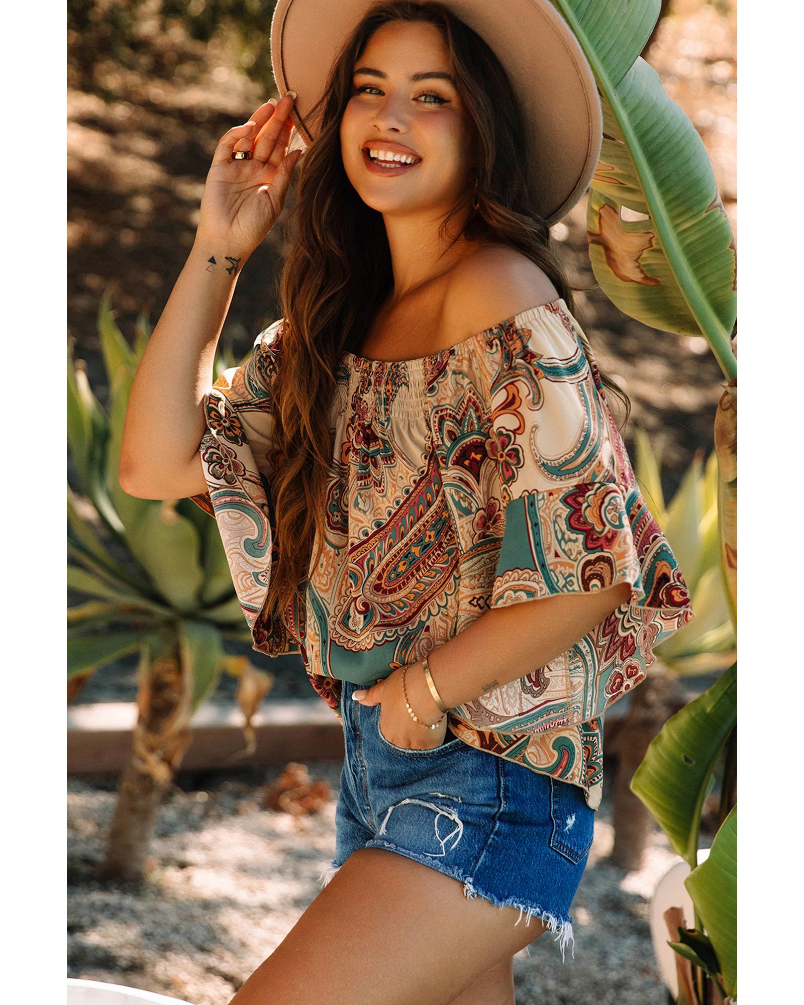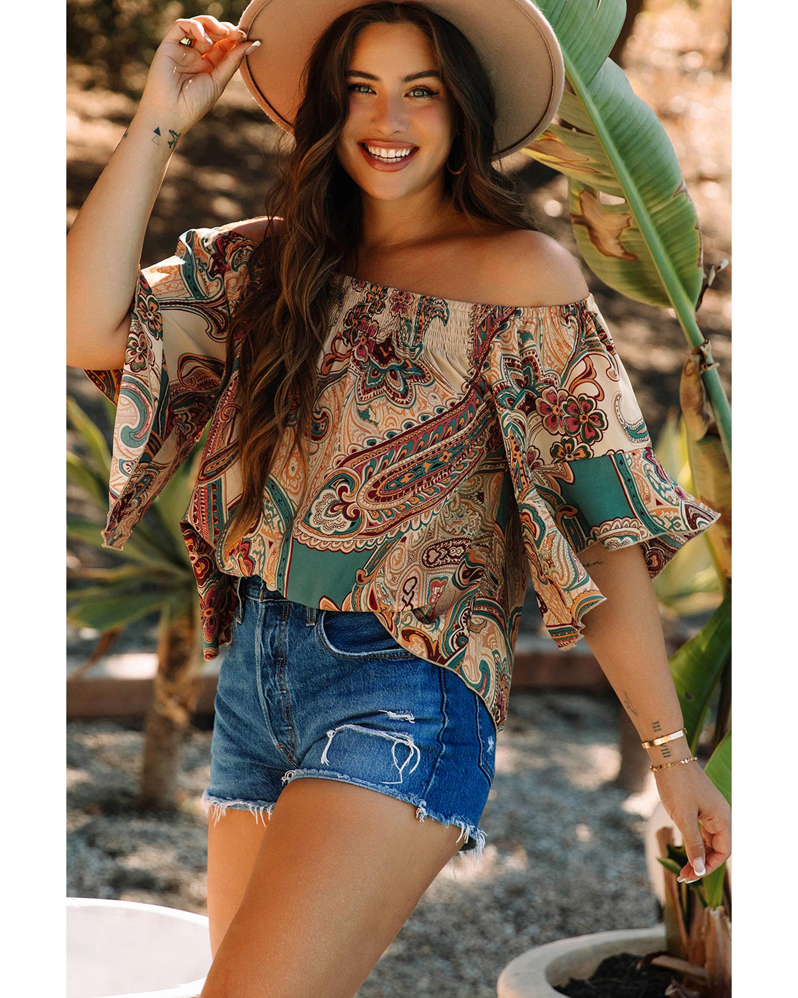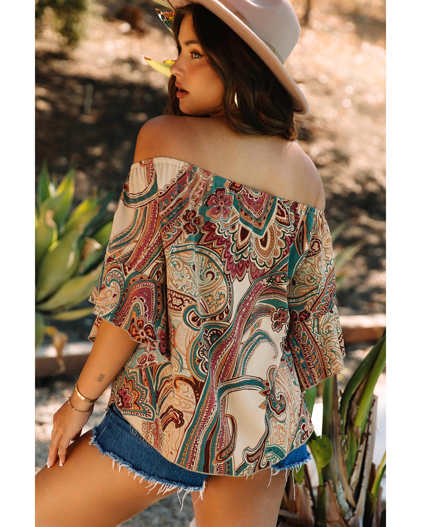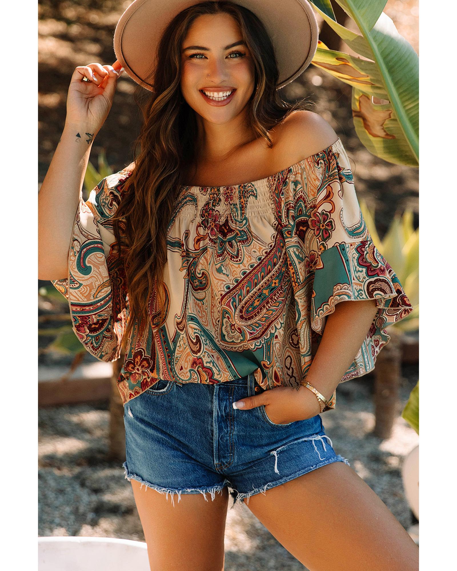 This blouse features a stylish paisley print with an off-shoulder design, complemented by ruffled draped sleeves. It offers a blend of elegance and comfort, making it suitable for various occasions.