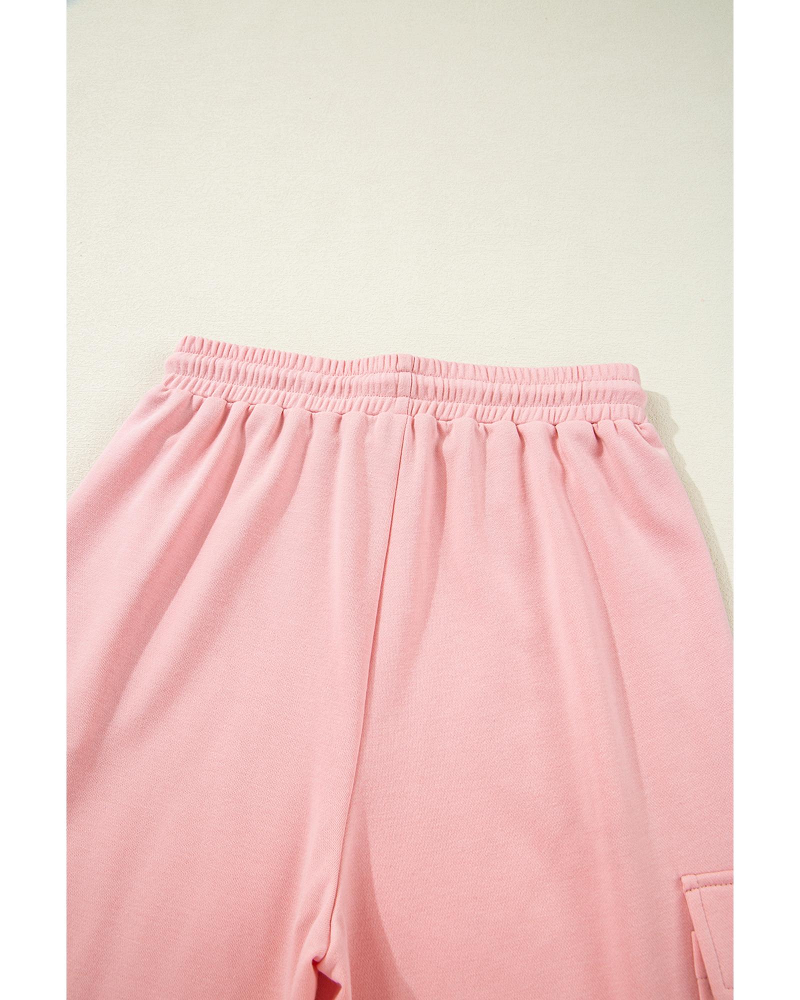 This set includes a stylish apricot pink half sleeve T-shirt and cargo sweatpants, designed for a trendy and comfortable fit. The versatile design makes it suitable for casual outings, workouts, or lounging, accommodating different body shapes.