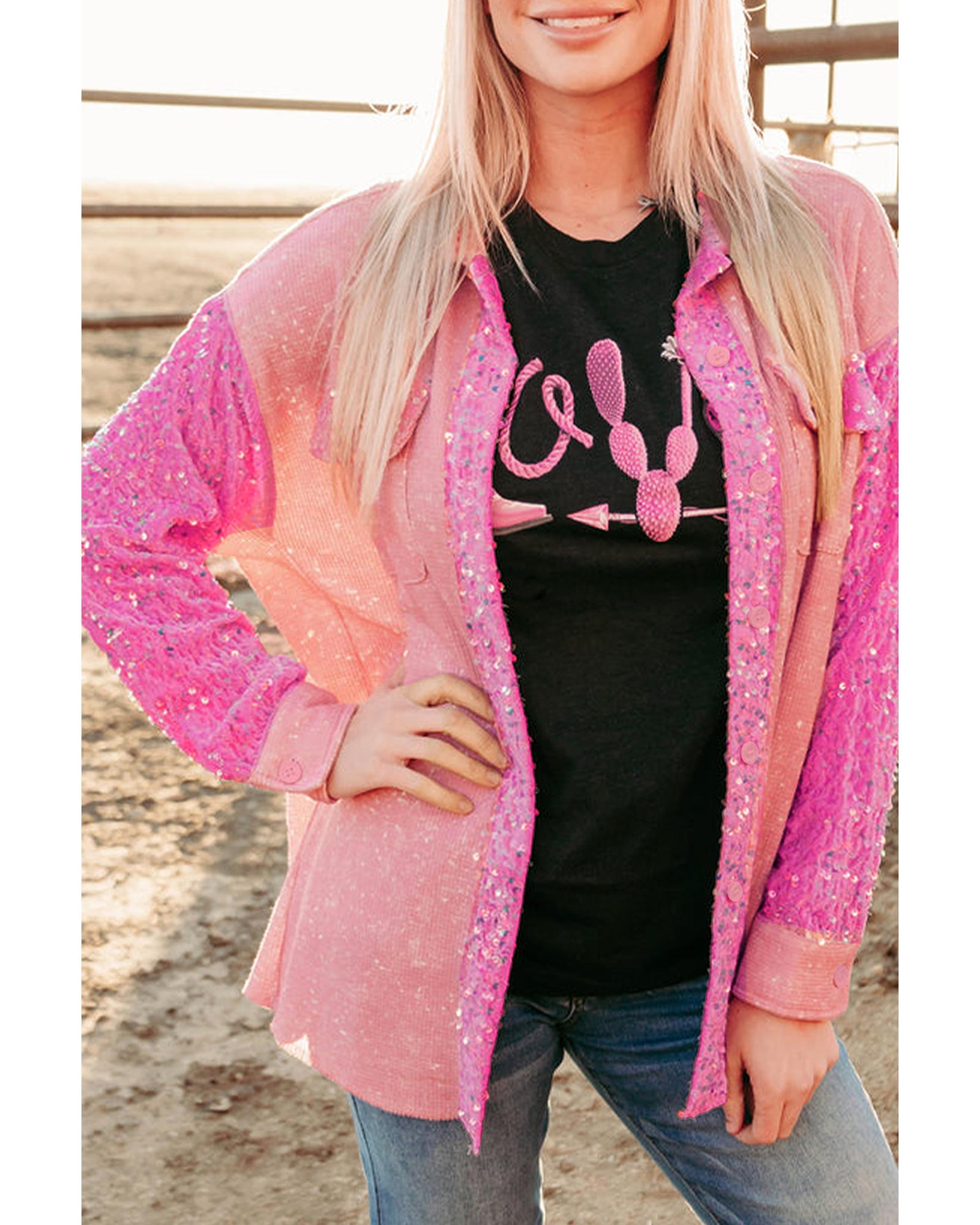 This apricot pink shacket features a mineral wash finish that provides a vintage-inspired look. Its sequin patchwork design adds a touch of sparkle, while the flap pockets offer practical storage. Designed with an oversized fit, it is ideal for layering and offers high elasticity for comfort.