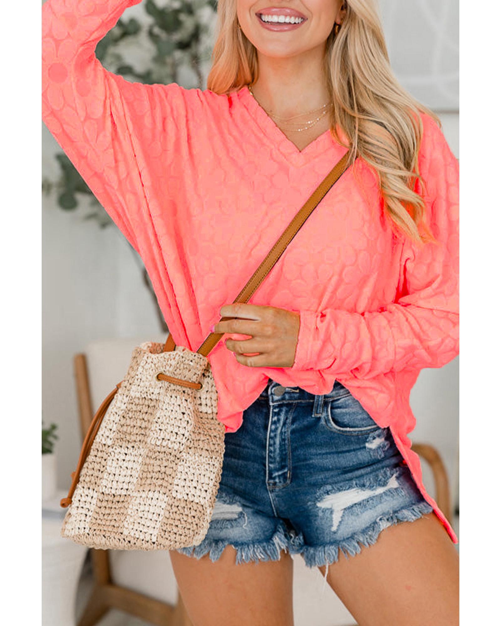 Apricot Pink Oversized Floral Jacquard V Neck Long Sleeve Top – L