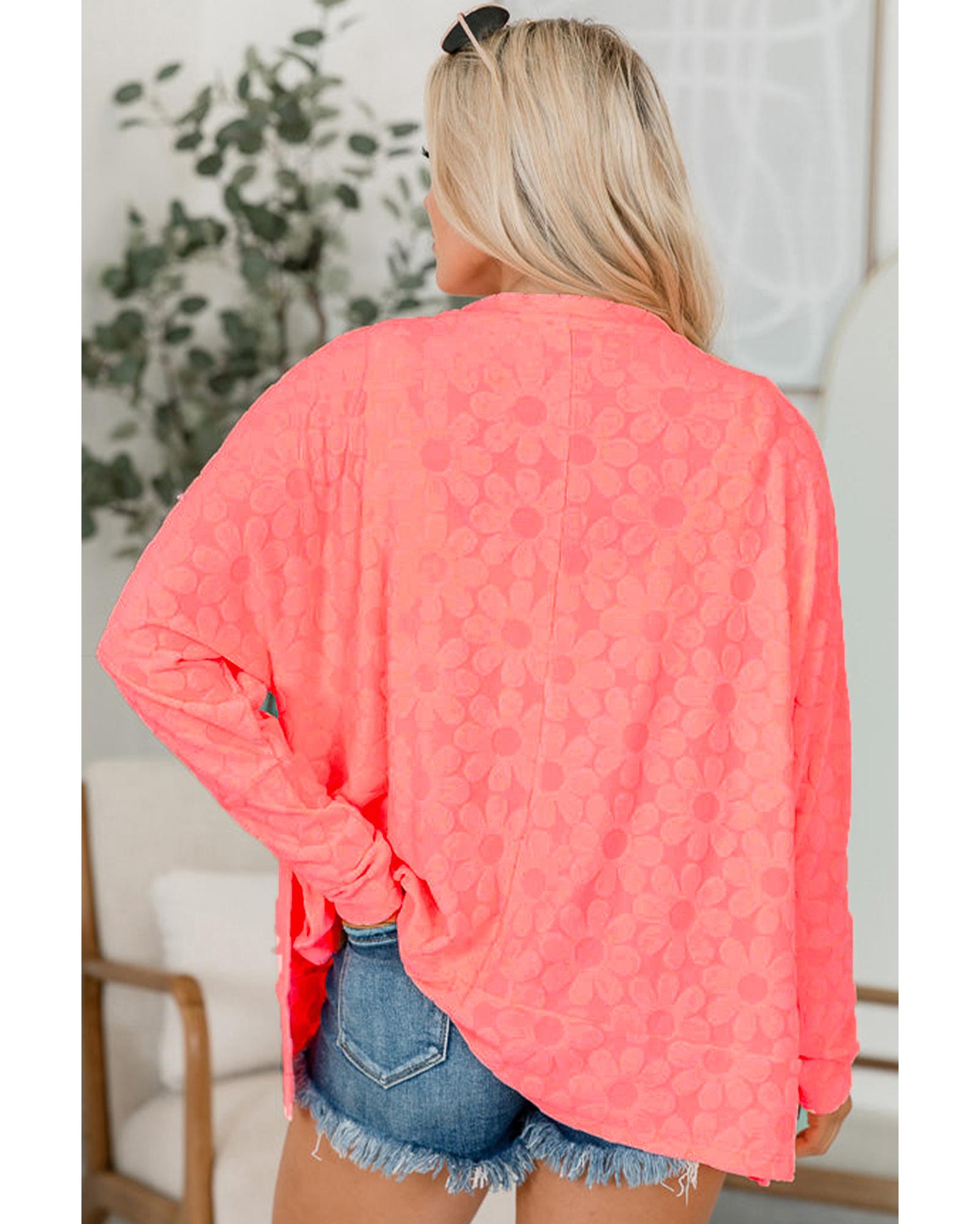 This oversized floral jacquard V-neck long sleeve top combines trendy style with comfort. Its elegant floral pattern and versatile design make it suitable for various occasions and weather conditions.