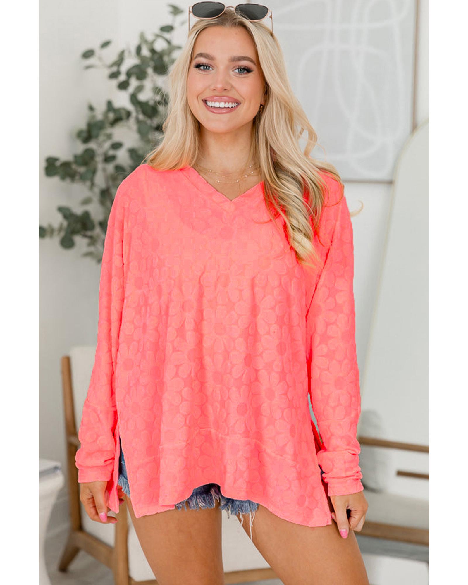 This oversized floral jacquard V-neck long sleeve top offers a stylish and comfortable fit with a trendy design. The beautiful floral pattern adds elegance and texture, making it suitable for various occasions and weather conditions.