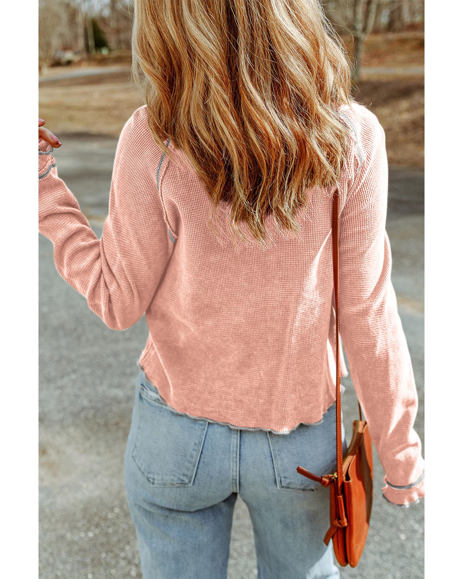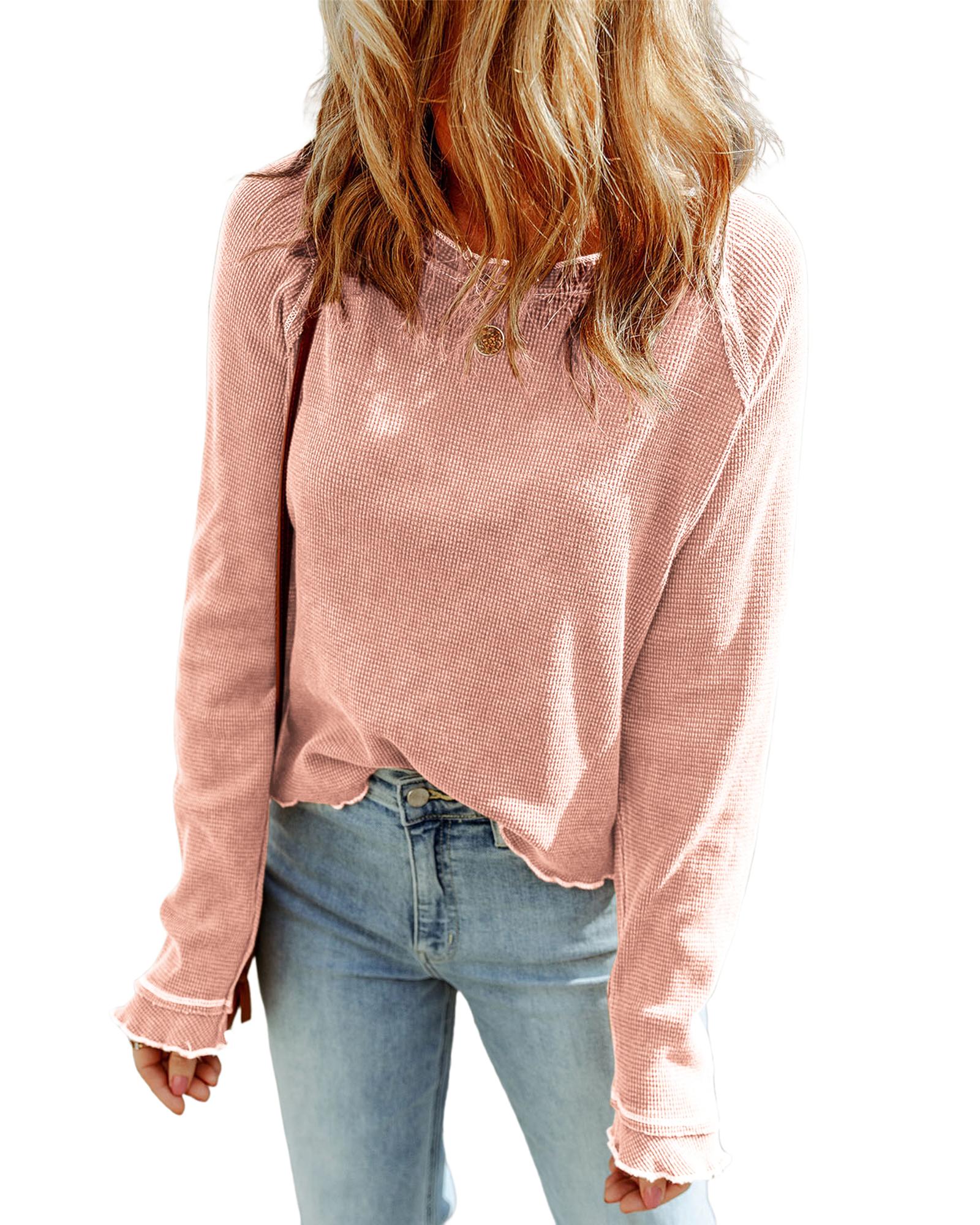 This textured round neck long sleeve top features a stylish apricot pink color and a unique textured design. It offers a comfortable fit with a versatile style suitable for various occasions. The top is designed with a high neckline and long sleeves, making it a fashionable and functional addition to your wardrobe.