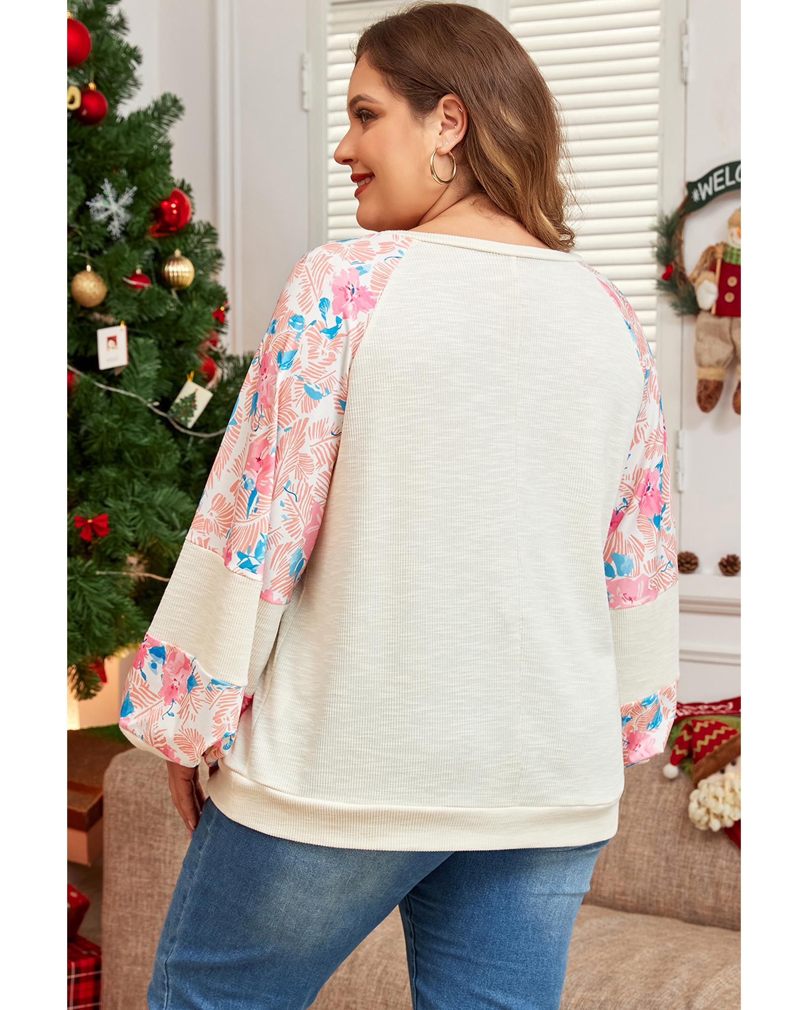 Apricot Plus Size Floral Patchwork Ribbed Puff Sleeve Top – 1X