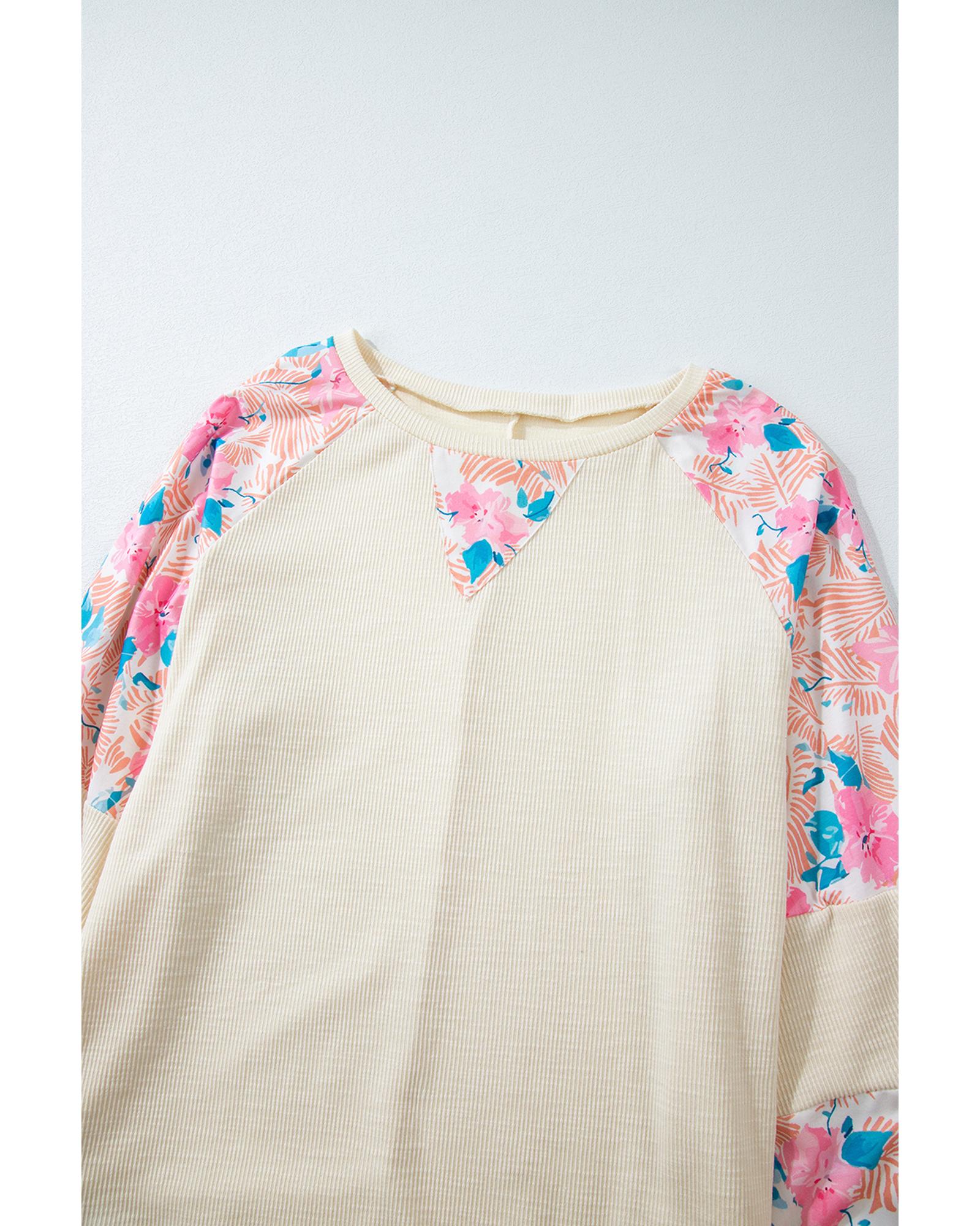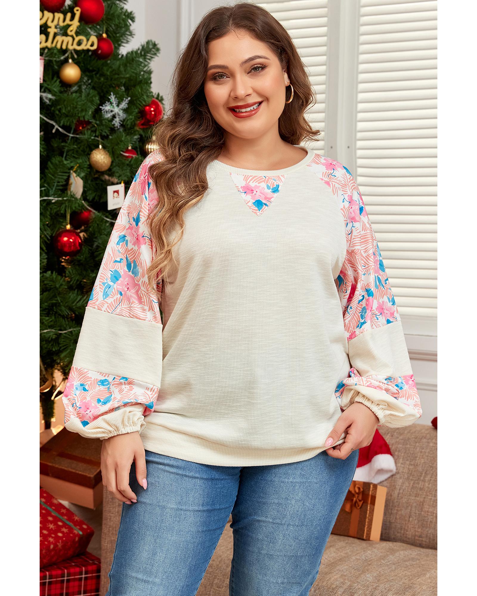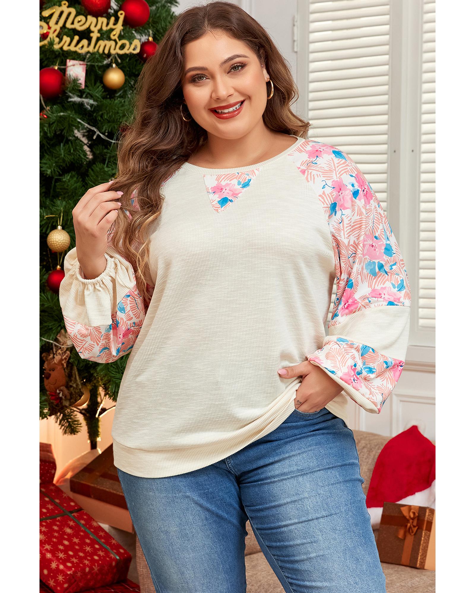 Apricot Plus Size Floral Patchwork Ribbed Puff Sleeve Top – 2X