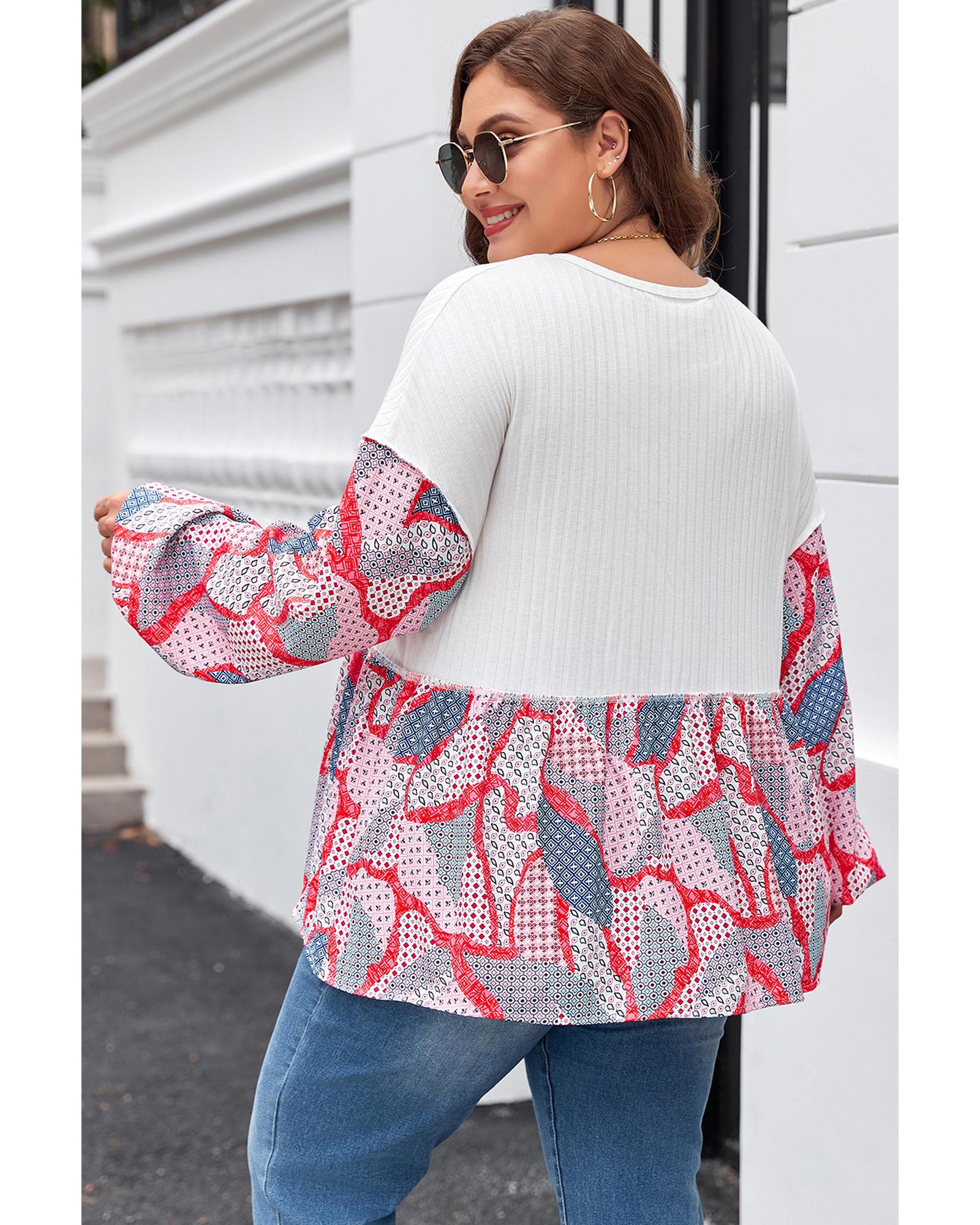 - Stylish plus size blouse with a printed patchwork design