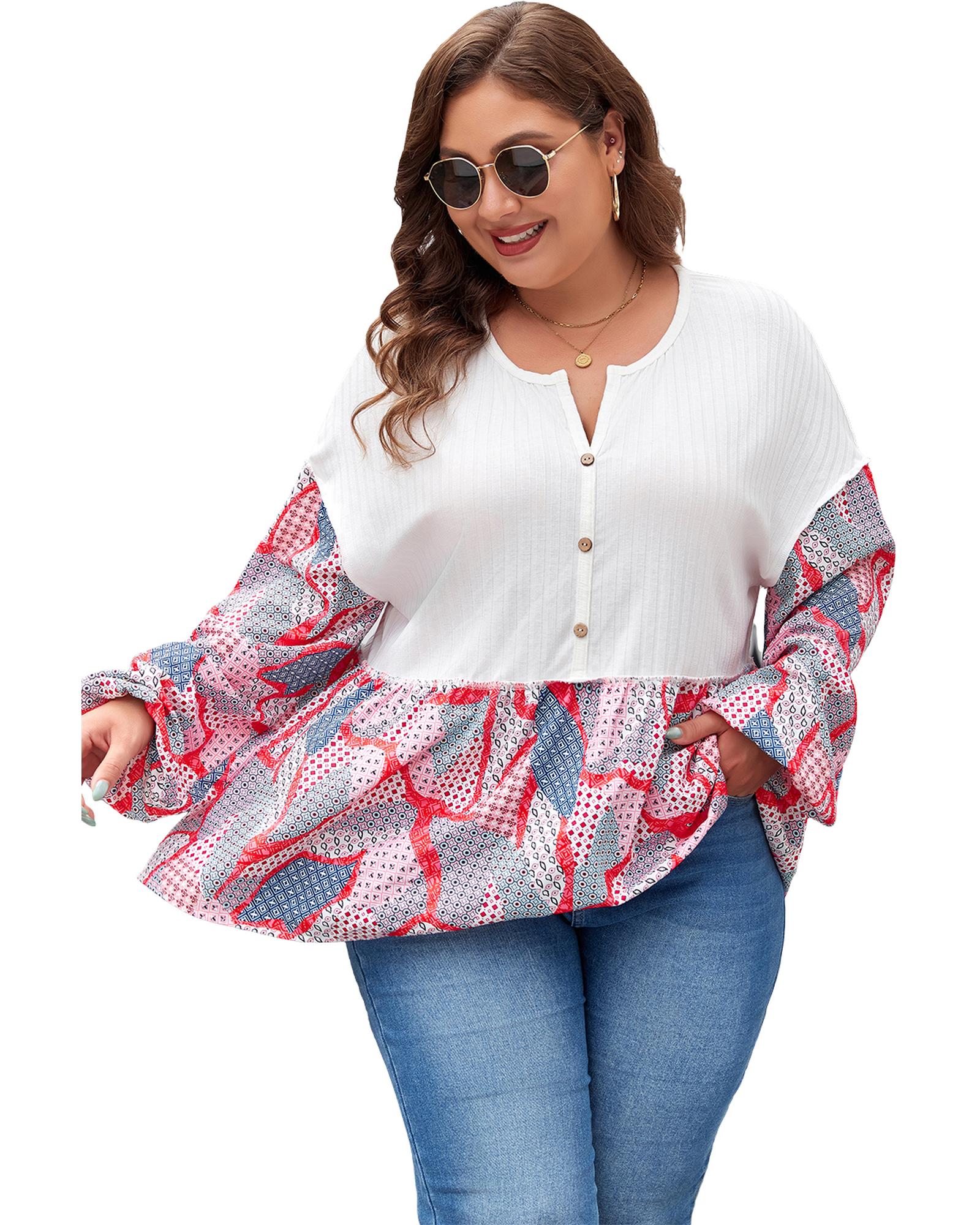 This plus size printed patchwork blouse features a textured fabric and a stylish buttoned design, creating a fashionable and unique look. Its comfortable flared silhouette makes it suitable for various occasions, allowing you to make a bold fashion statement.