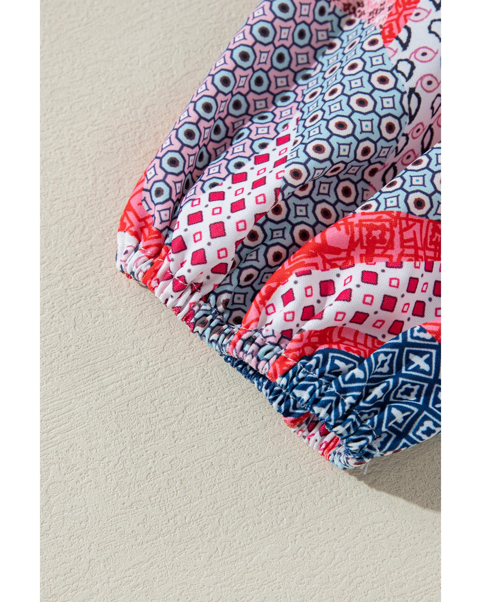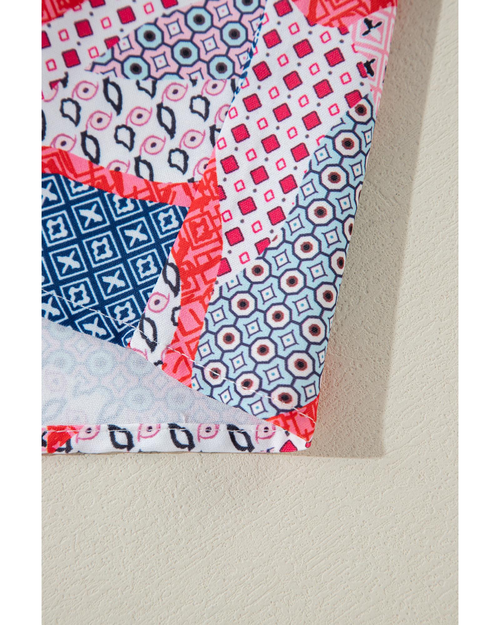 This stylish plus size blouse features a unique printed patchwork design combined with textured fabric to create a fashionable and eye-catching look. The buttoned details add visual interest, while the comfortable flared silhouette makes it suitable for various occasions. Designed with a trendy fitted style, it offers a modern and chic appearance.