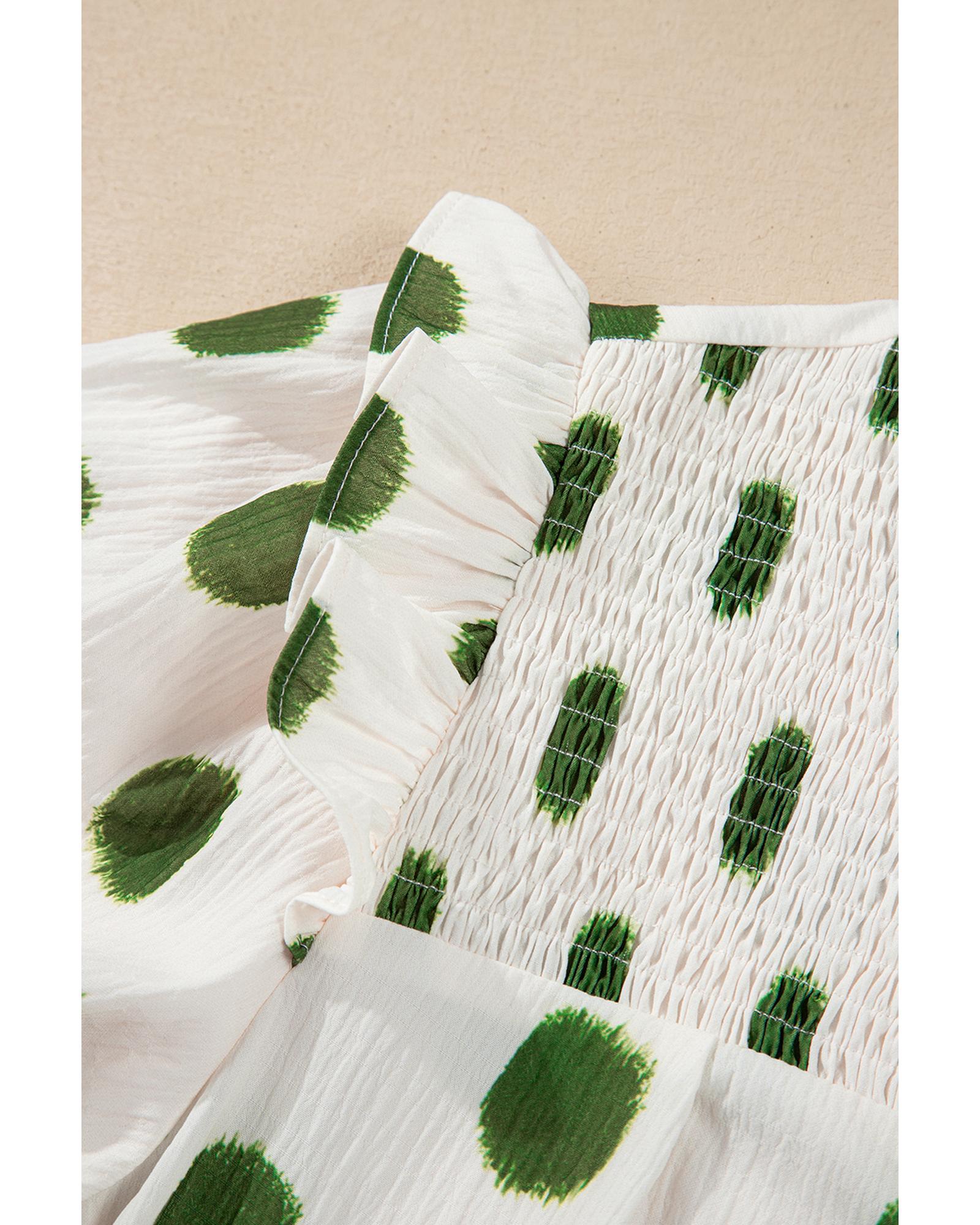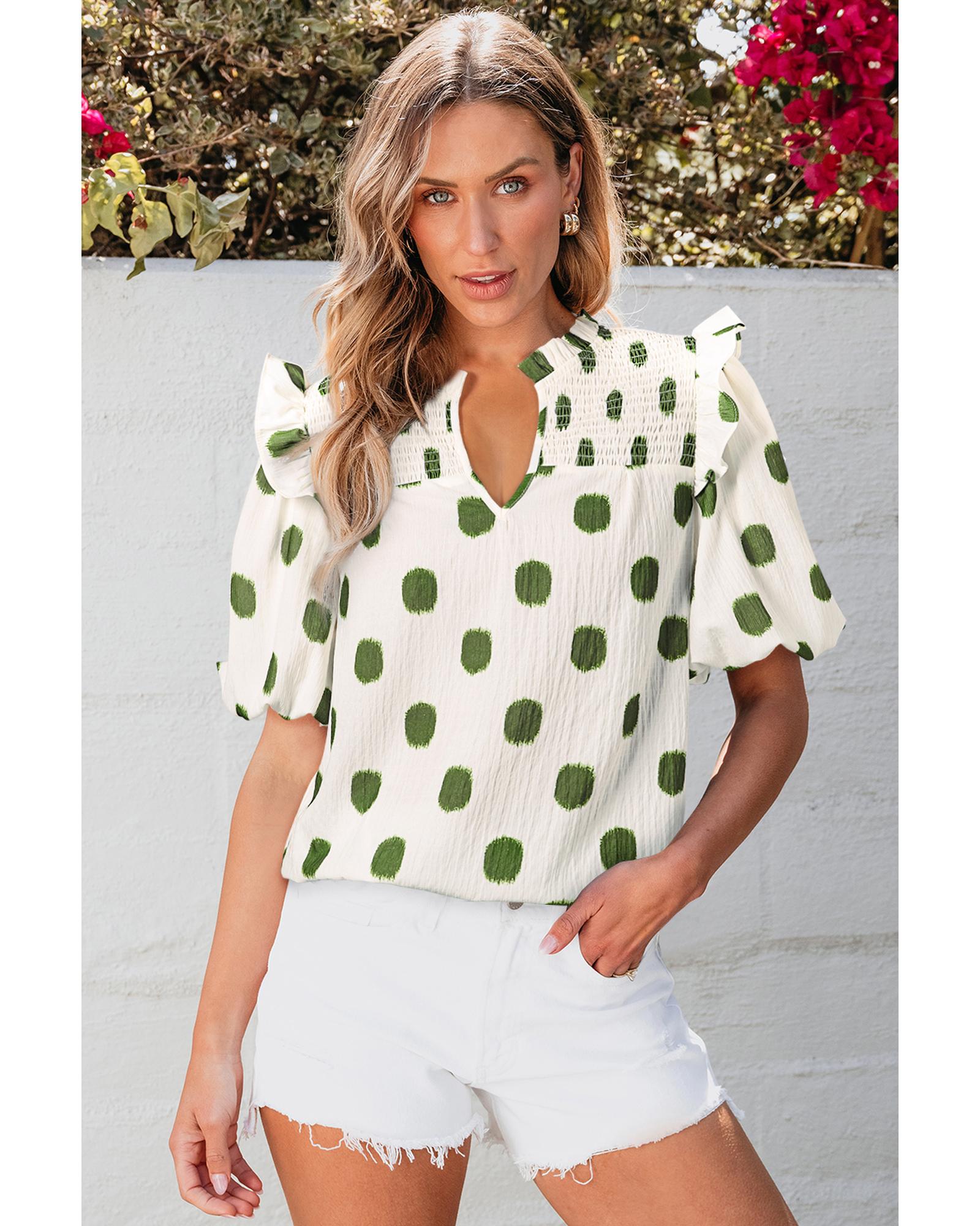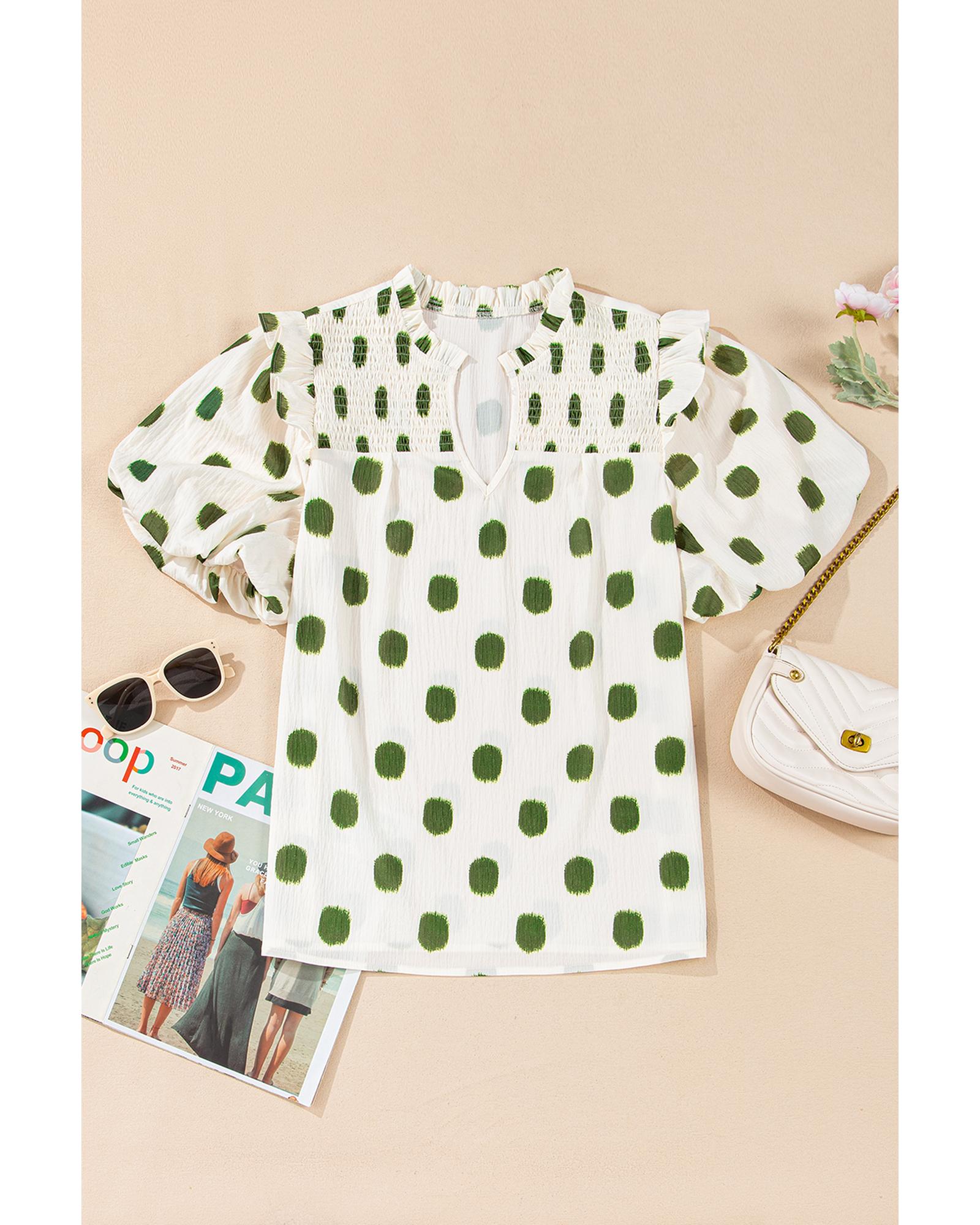 This blouse features a trendy fitted design with a charming apricot color and playful polka dot print. It combines stylish details such as a shirred yoke, notched neckline, frilled collar, shoulder ruffles, and balloon sleeves, creating a feminine and fashionable look.