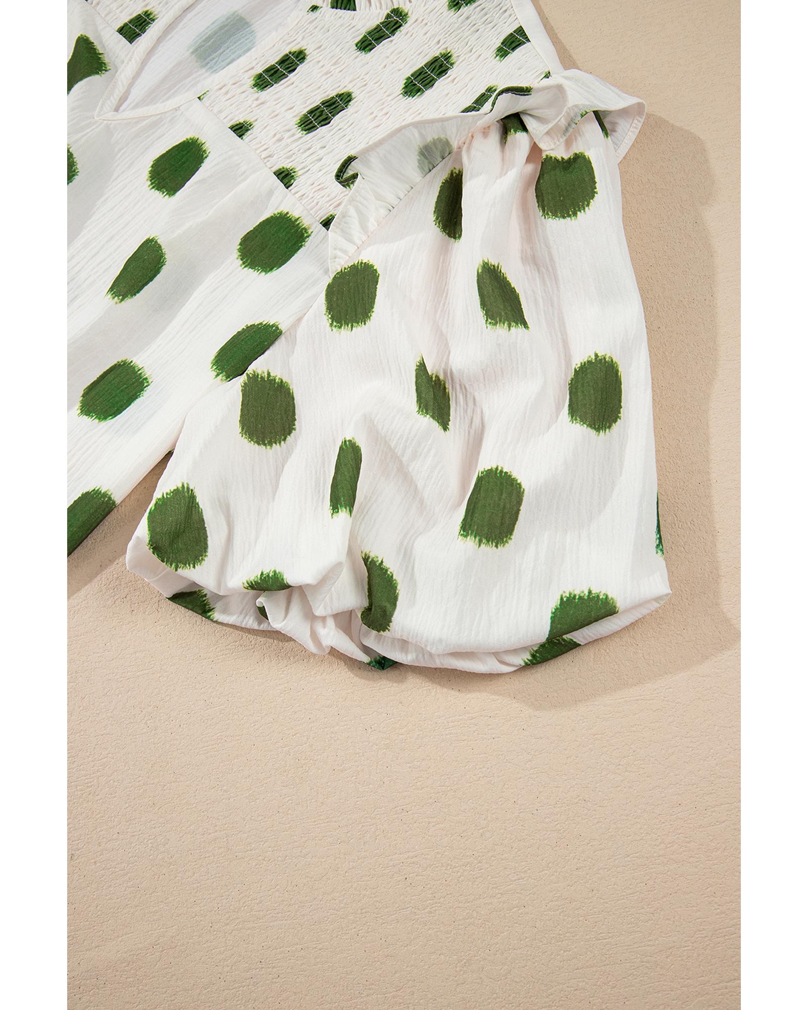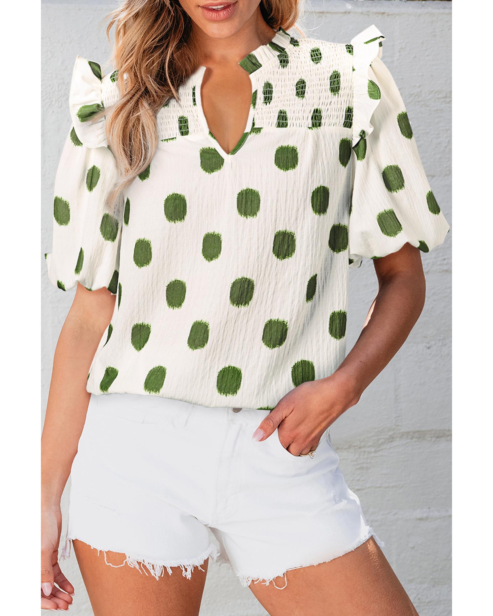 This blouse features a trendy fitted design with a charming apricot color and playful polka dot print. It combines stylish details such as a shirred yoke, notched V-neckline with a frilled collar, shoulder ruffles, and balloon sleeves, creating a feminine and fashionable look.