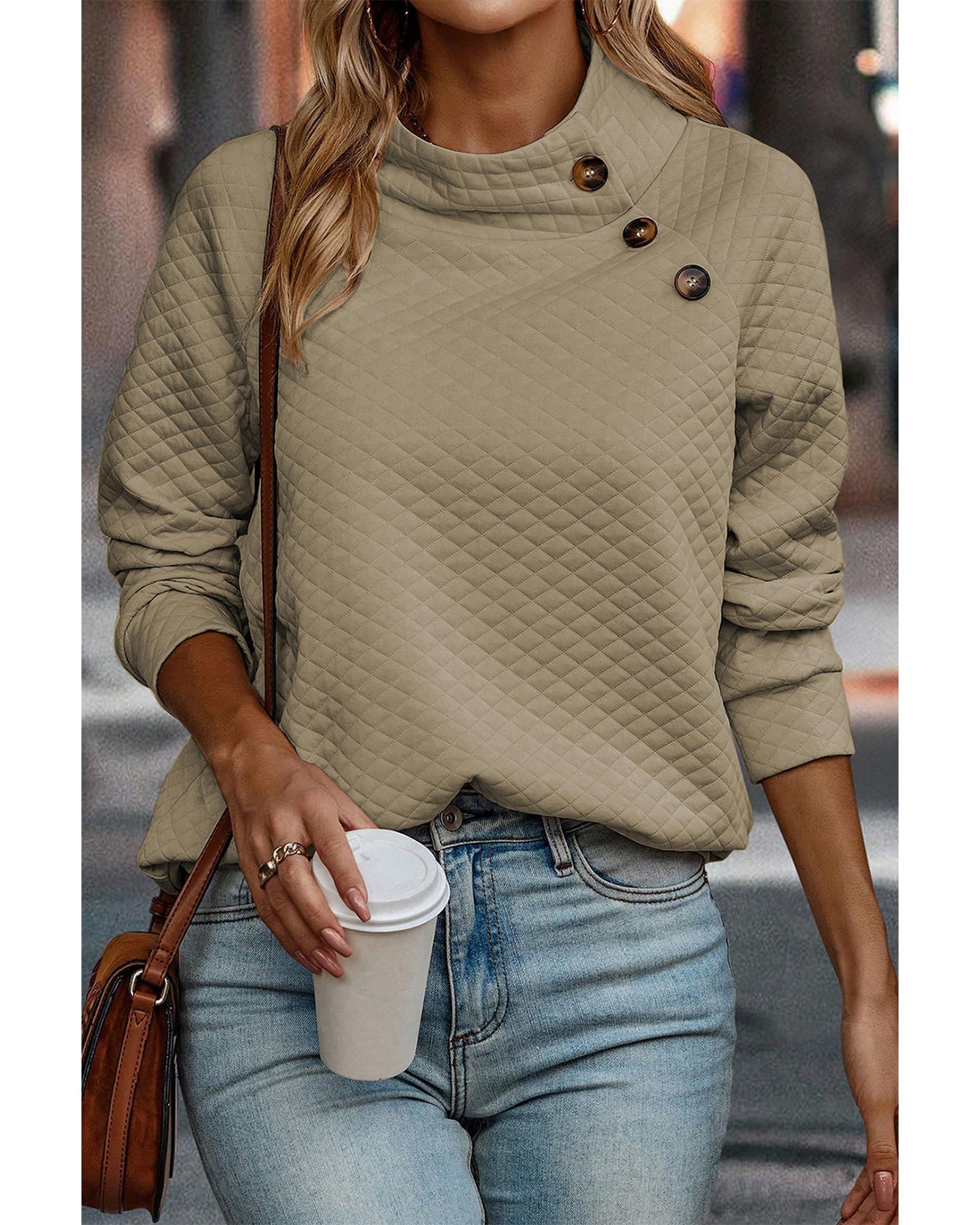 This pullover sweatshirt features a stylish quilted design with a stand neckline and buttoned detail, offering a trendy and sophisticated look. Its apricot color adds a touch of elegance, making it suitable for various casual occasions. Crafted from high-quality materials, it ensures durability and comfort for everyday wear.