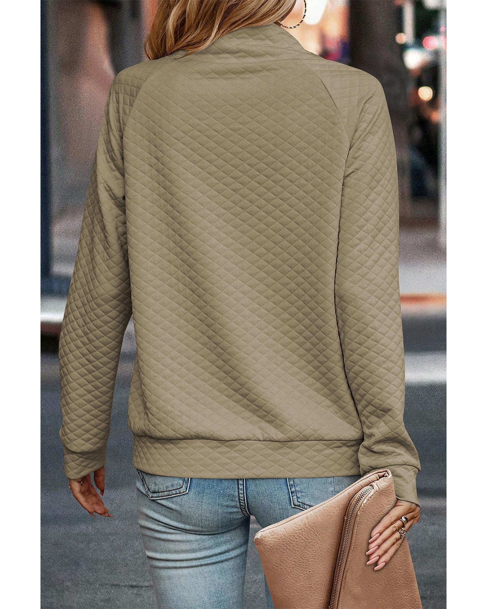 This pullover sweatshirt features a quilted design with a stand neckline and buttoned closure, offering a stylish and comfortable option for casual wear. Its elegant apricot color adds a sophisticated touch, making it suitable for various casual occasions.