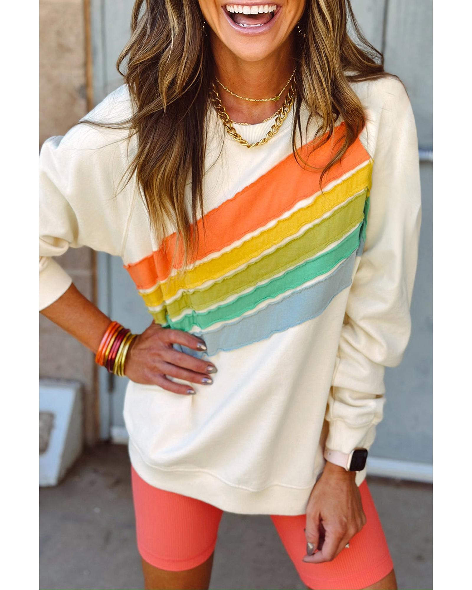This rainbow-colored striped pullover sweatshirt features a trendy fitted design with a classic crewneck style. It is ideal for layering during cooler weather and offers a vibrant, colorful look with its rainbow block design and stripes. Available in multiple sizes, it provides a comfortable fit suitable for various preferences.