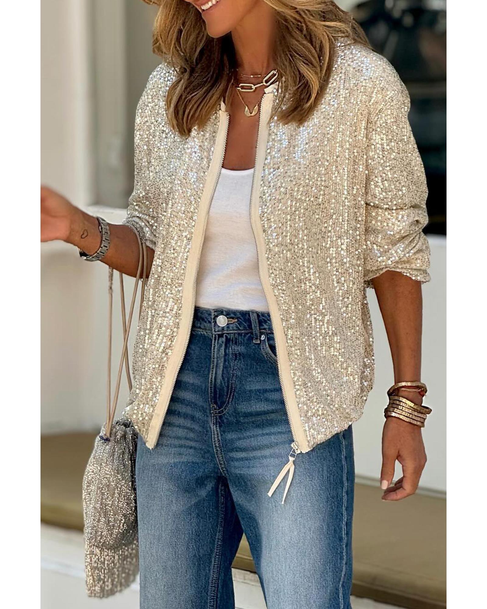 This stylish jacket features a trendy fitted design with a shimmering sequin embellishment, making it suitable for various occasions. It offers a versatile and timeless look with its classic round neck and long sleeves, combined with a convenient zip-up front for easy wear.