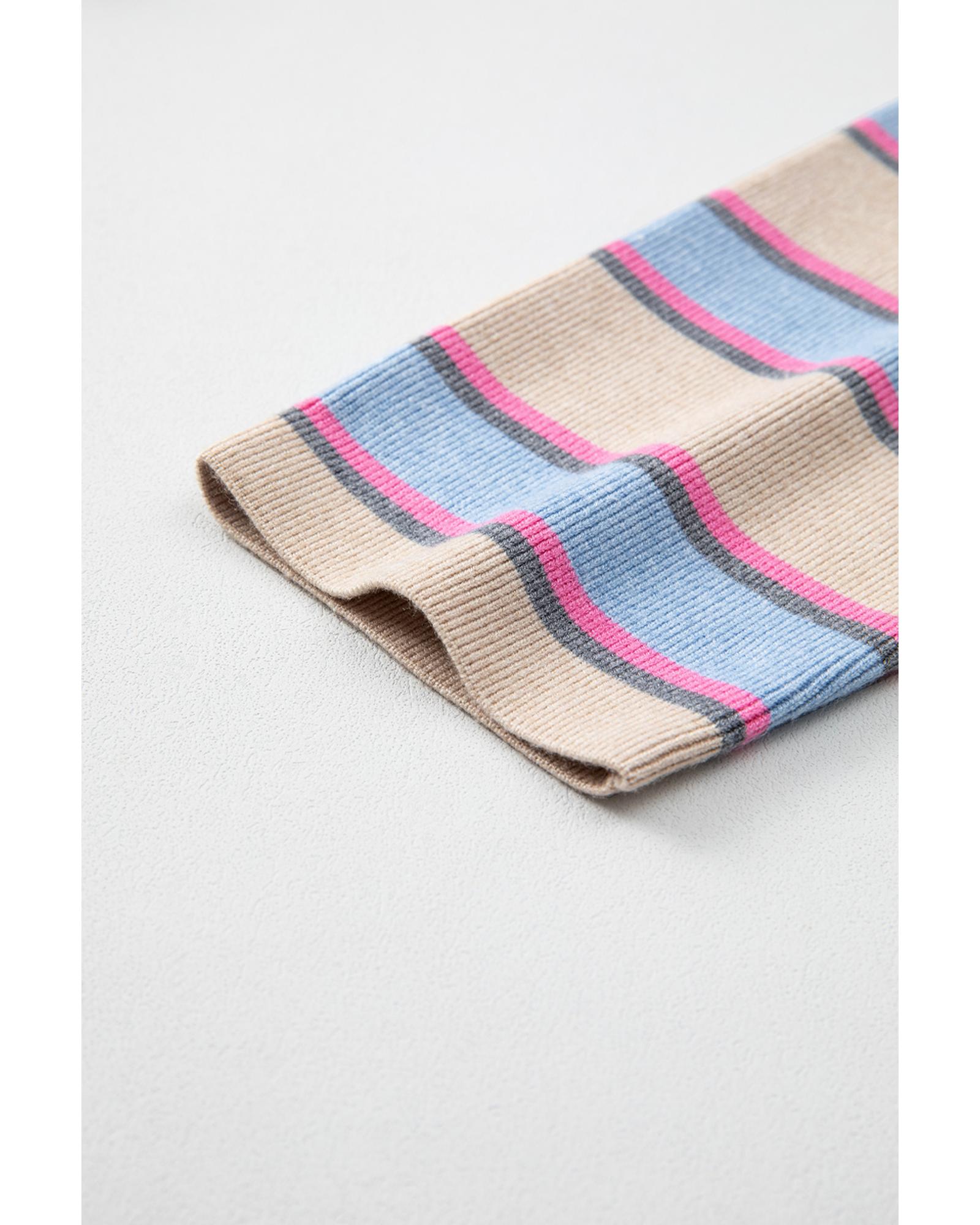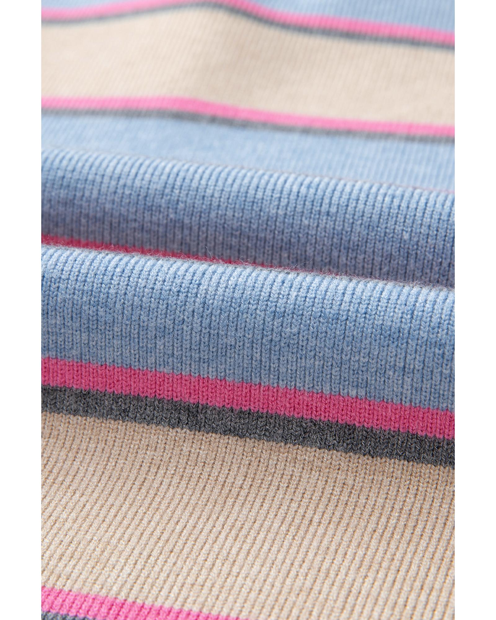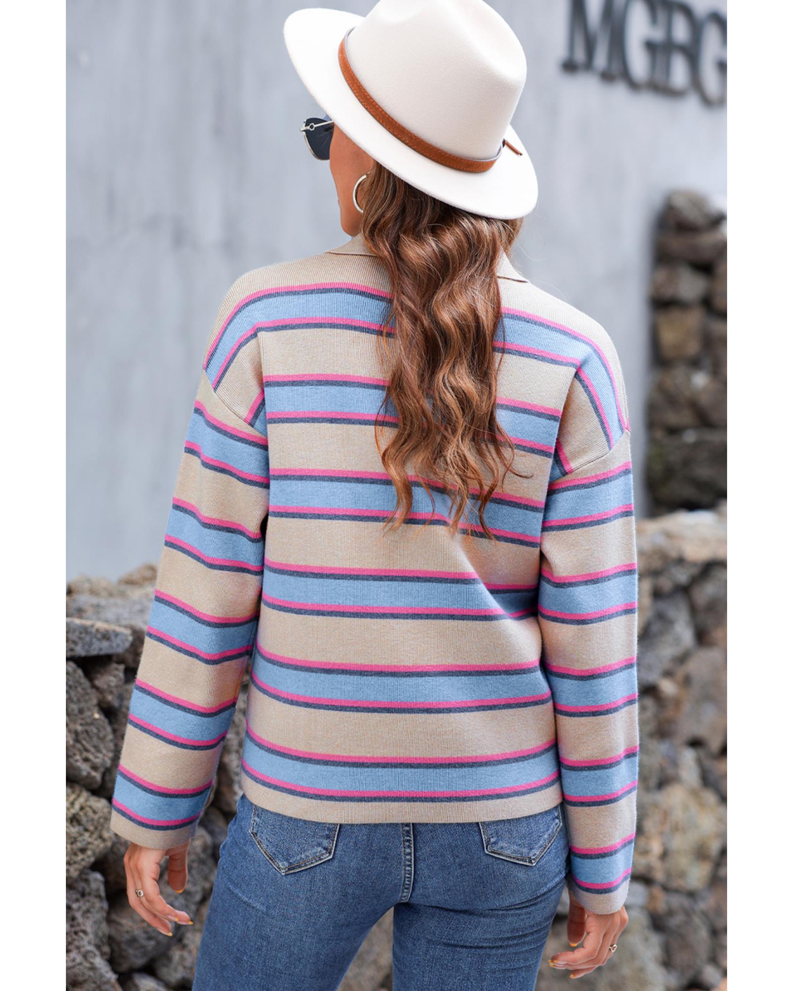 This sweater features a playful striped pattern combined with a sophisticated collared neckline and a chic V-neck design. Its cozy and relaxed drop shoulder sleeves make it a versatile piece suitable for various casual occasions. Designed with high elasticity, it offers a comfortable fit for everyday wear.