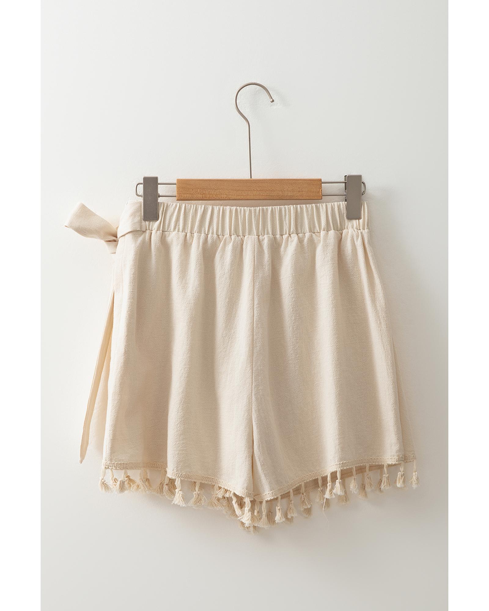This bohemian style mini skort features a charming apricot tassel trim and a unique wrap knot side design, offering a fashionable and playful look. Crafted from 100% cotton, it provides comfort and breathability, making it suitable for casual outings or stylish gatherings.
