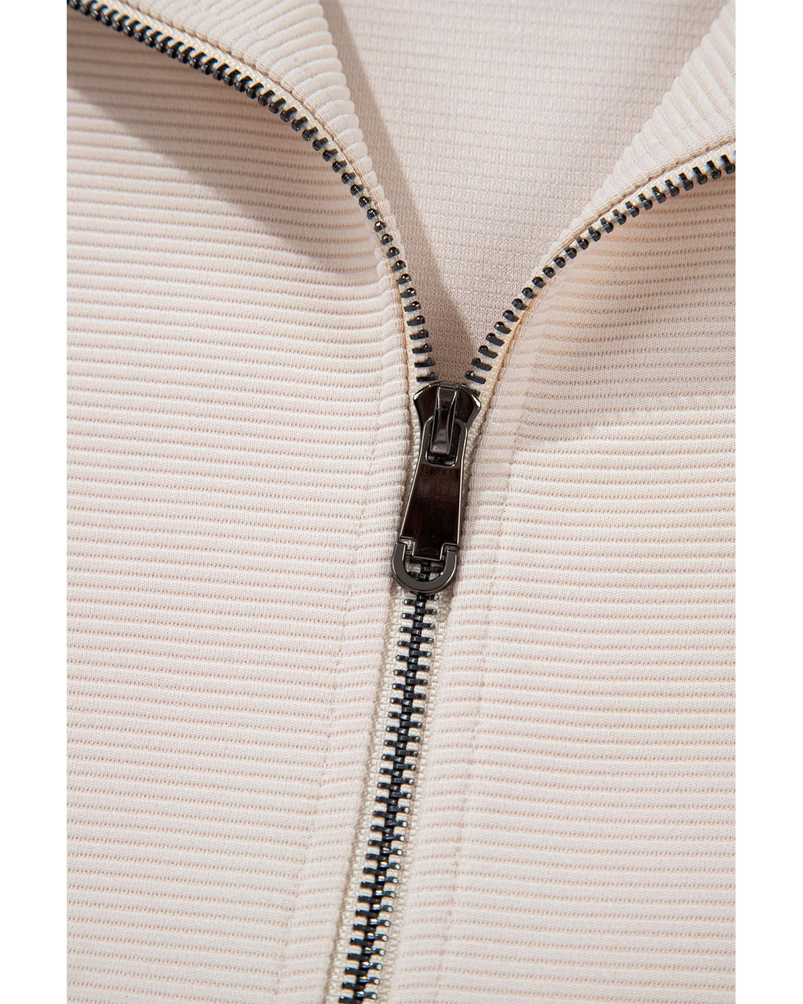 - Features a textured ruffled sleeve top with a zippered neckline for a contemporary style