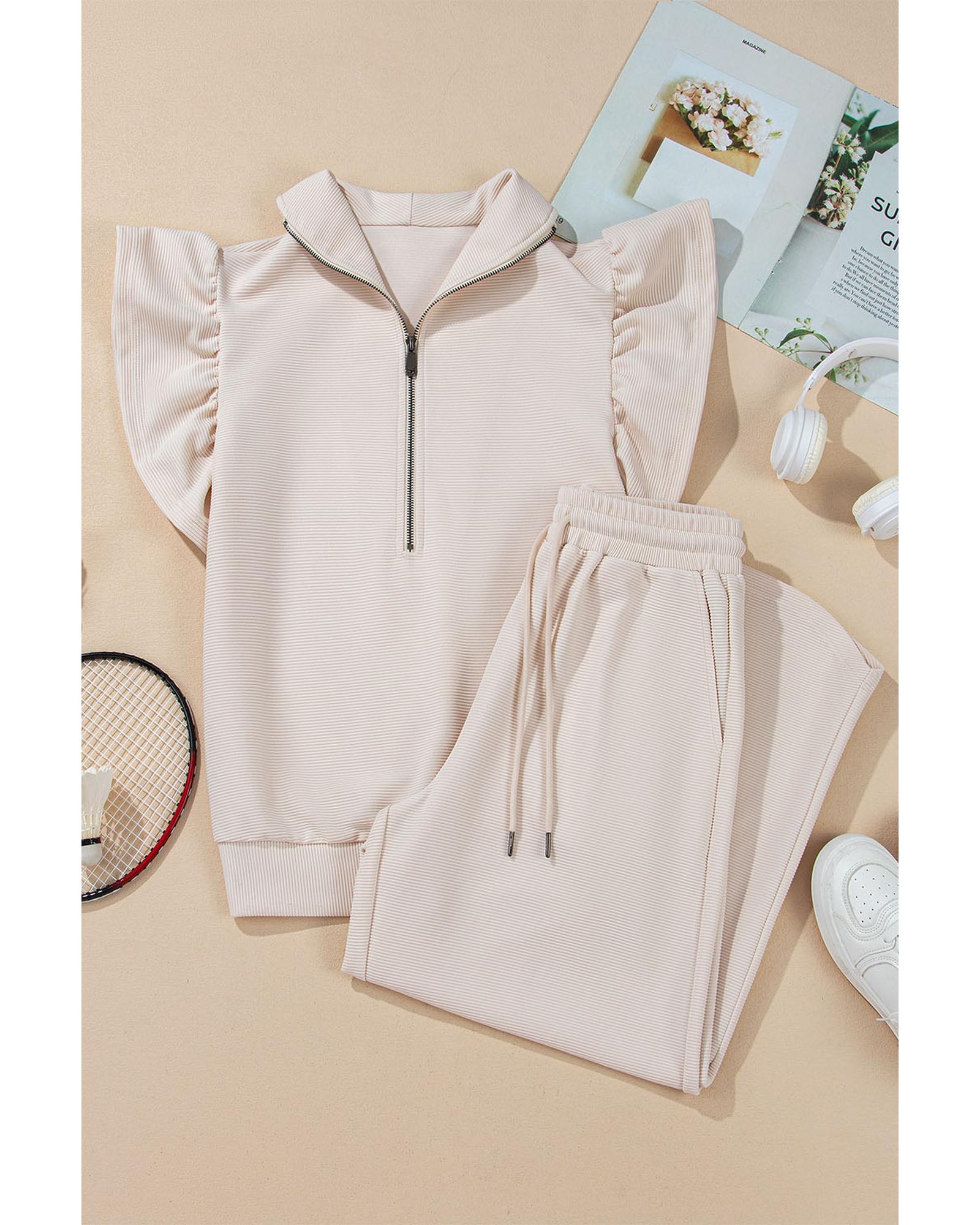 This stylish two-piece set features a textured ruffled sleeve top with a zippered neckline and wide-leg pants, offering a trendy and sophisticated look. The design combines modern details with comfortable fit, making it suitable for various occasions.