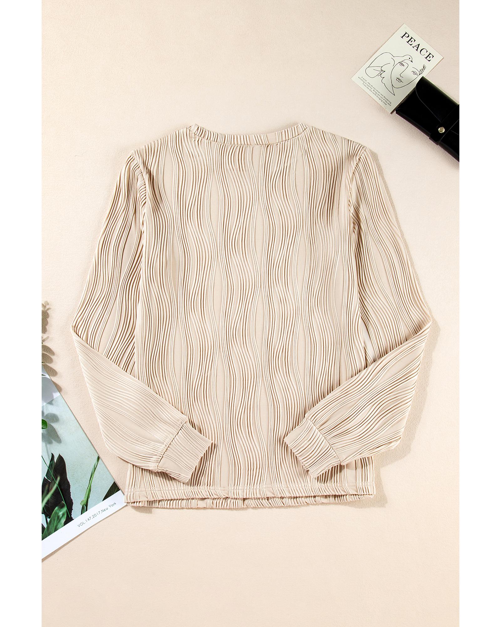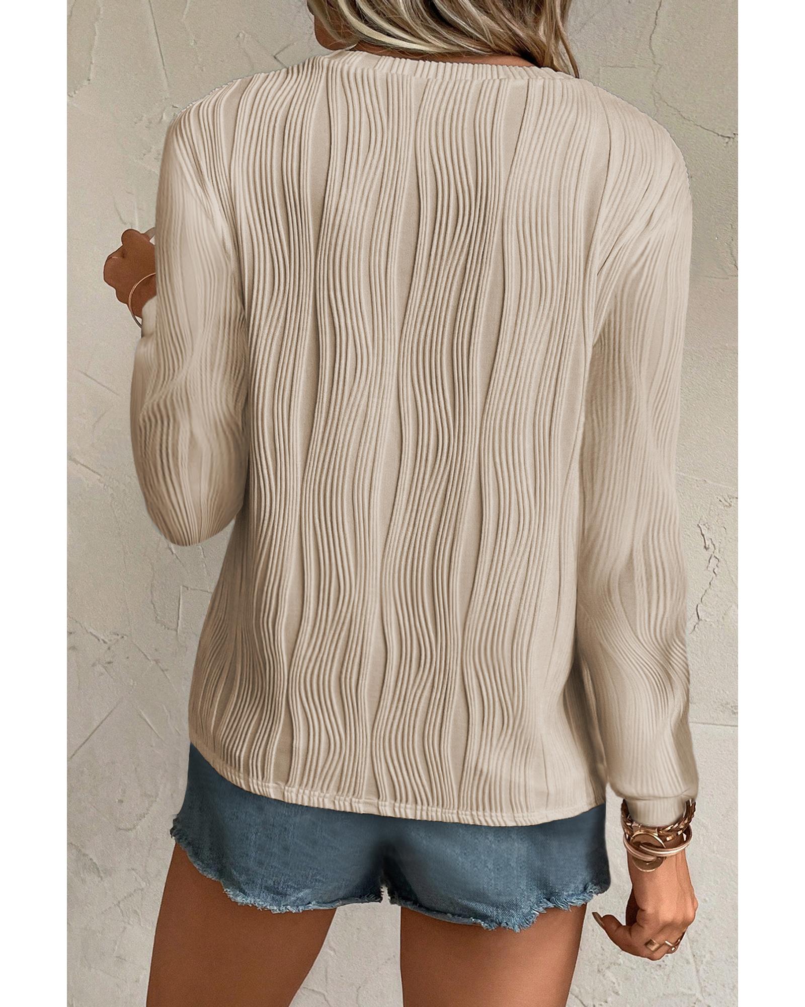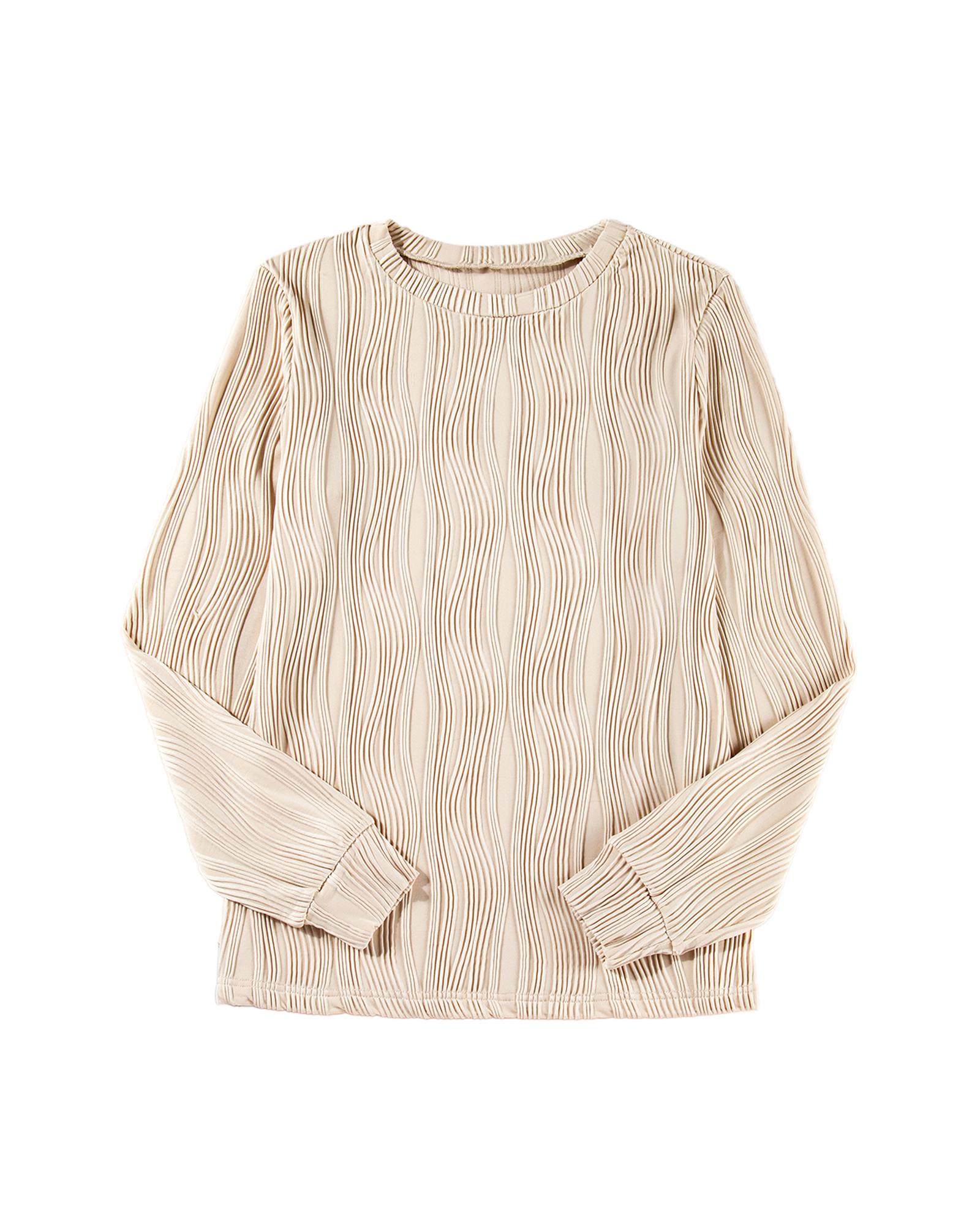 This textured wavy round neck long sleeve top offers a stylish and versatile addition to any casual wardrobe. Designed with a trendy fitted silhouette, it features intricate fabric details and a classic round neckline suitable for various occasions. Its solid color and concise style make it easy to pair with different jeans and pants, making it a timeless choice for everyday wear.