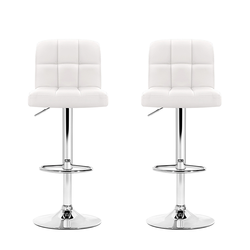 This set includes two stylish bar stools designed for comfort and modern aesthetics. Upholstered in faux leather with thick padding, these stools feature a patterned backrest and a semi-circular footrest. The adjustable height and 360-degree swivel seat provide versatile seating options, while the large stable base and floor protector ensure safety and floor protection.