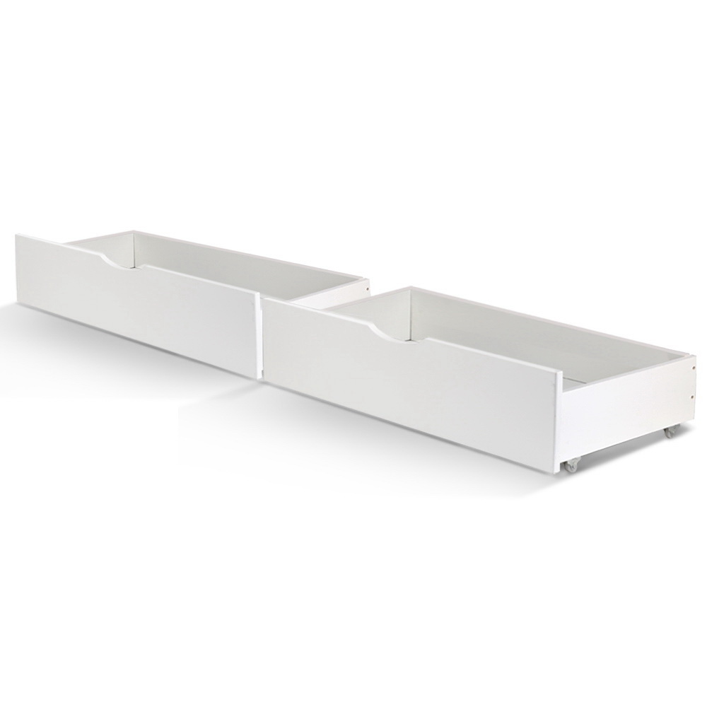 This product includes two wooden trundle drawers designed to fit under a single bed, providing convenient storage space. Made from eco-friendly solid pine wood, these drawers feature a white contemporary finish that complements various bedroom decors. They are equipped with smooth castors for easy mobility and have safe, non-toxic finishes with secure edges and air gap handles for safety and ease of use.
