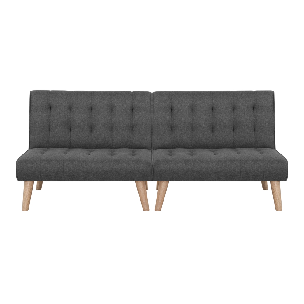 This versatile sofa bed features a modern design with a tufted appearance and is upholstered in durable faux linen fabric. It offers adjustable reclining positions, allowing it to function as a comfortable two-seater sofa or be transformed into a bed for guests. The sturdy wooden frame and solid rubber wood legs ensure stability and support, making it suitable for various living spaces.