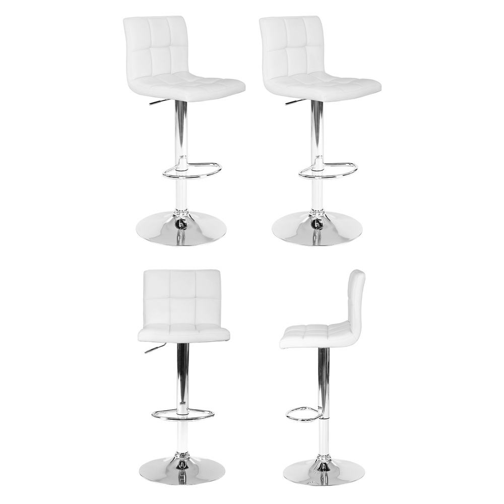 This set includes four stylish bar stools designed for comfort and modern aesthetics. Upholstered in faux leather with thick padding, these stools feature a checkered backrest and a semi-circular footrest. The adjustable height and 360-degree swivel seat provide versatile seating options, while the sturdy base ensures stability and floor protection.
