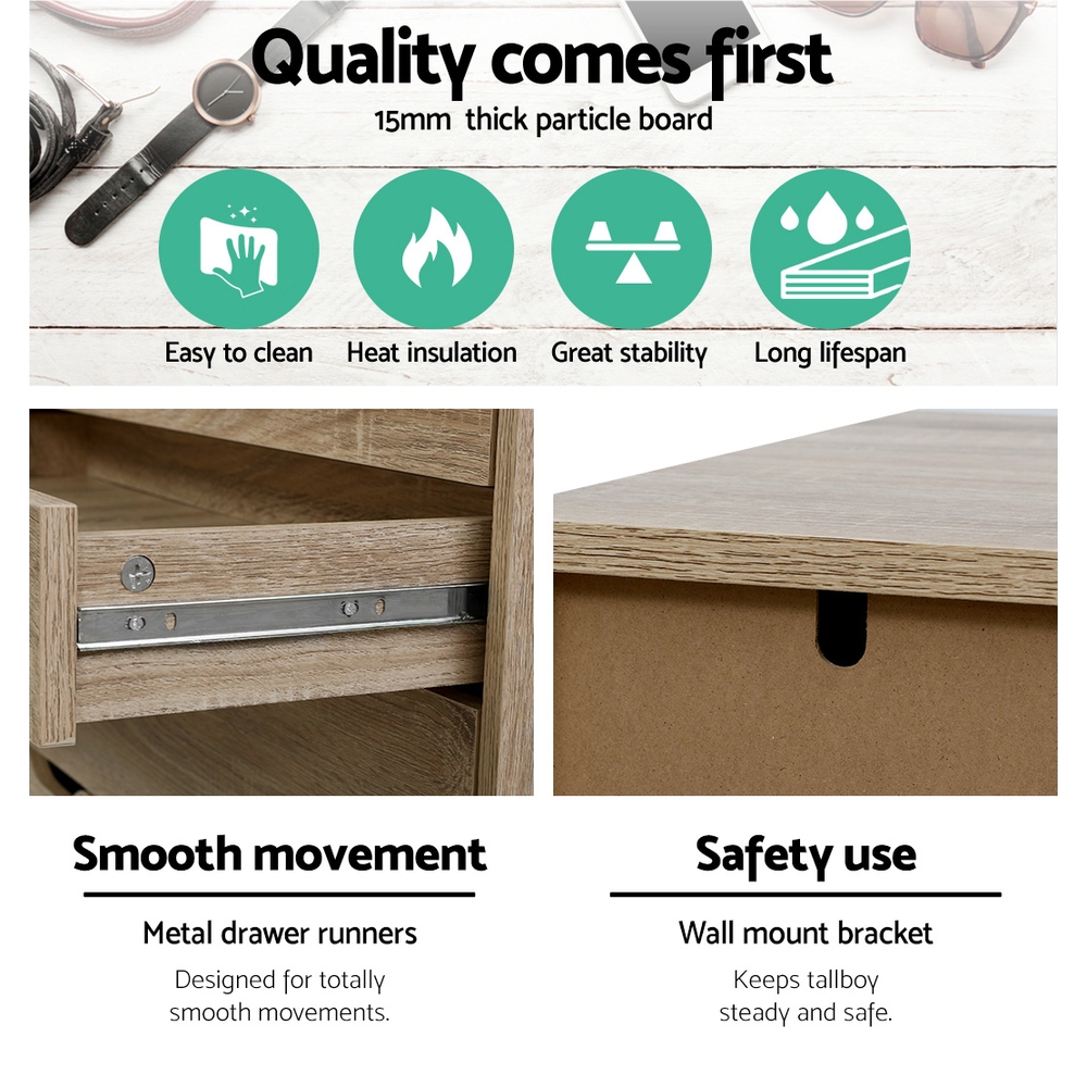 This 6-drawer tallboy offers a practical storage solution with a sleek, modern design. Made from durable materials, it features multiple drawers to organize clothes, personal items, or household essentials, helping to keep your space tidy and stylish. Its woodgrain finish and minimalist handles complement various interior styles, while the included wall mount bracket ensures safety and stability.