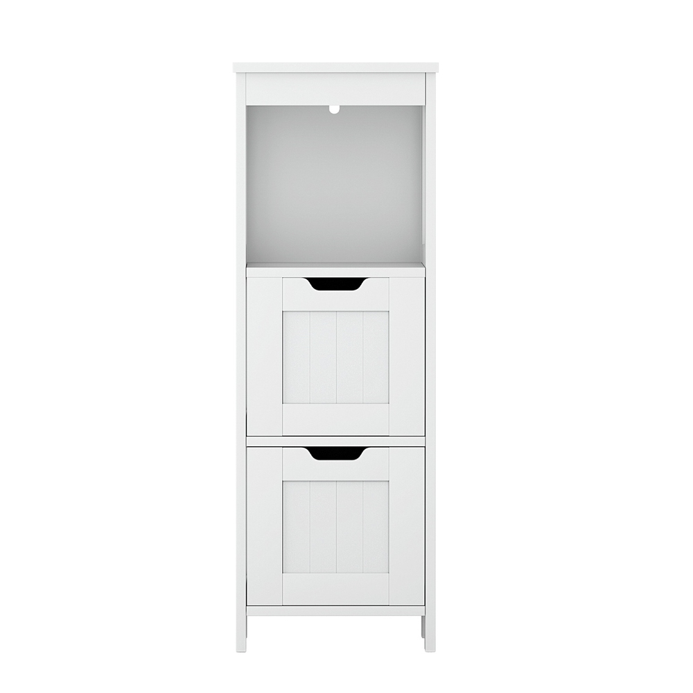 The storage cabinet offers a sleek and functional solution for maximizing your space. Its slim, vertical design allows it to fit effortlessly into tight areas while providing ample storage options. It features two drawers, an open compartment, and a cabinet top, making it suitable for organizing essentials in the bathroom, bedroom, or living room. Made from durable MDF with a painted finish, the cabinet is built to last and easy to clean. An anti-toppling device ensures safety, and the elevated base prevents water stains while improving ventilation. Its clean white finish complements most decor styles, adding a touch of charm and practicality to your home.