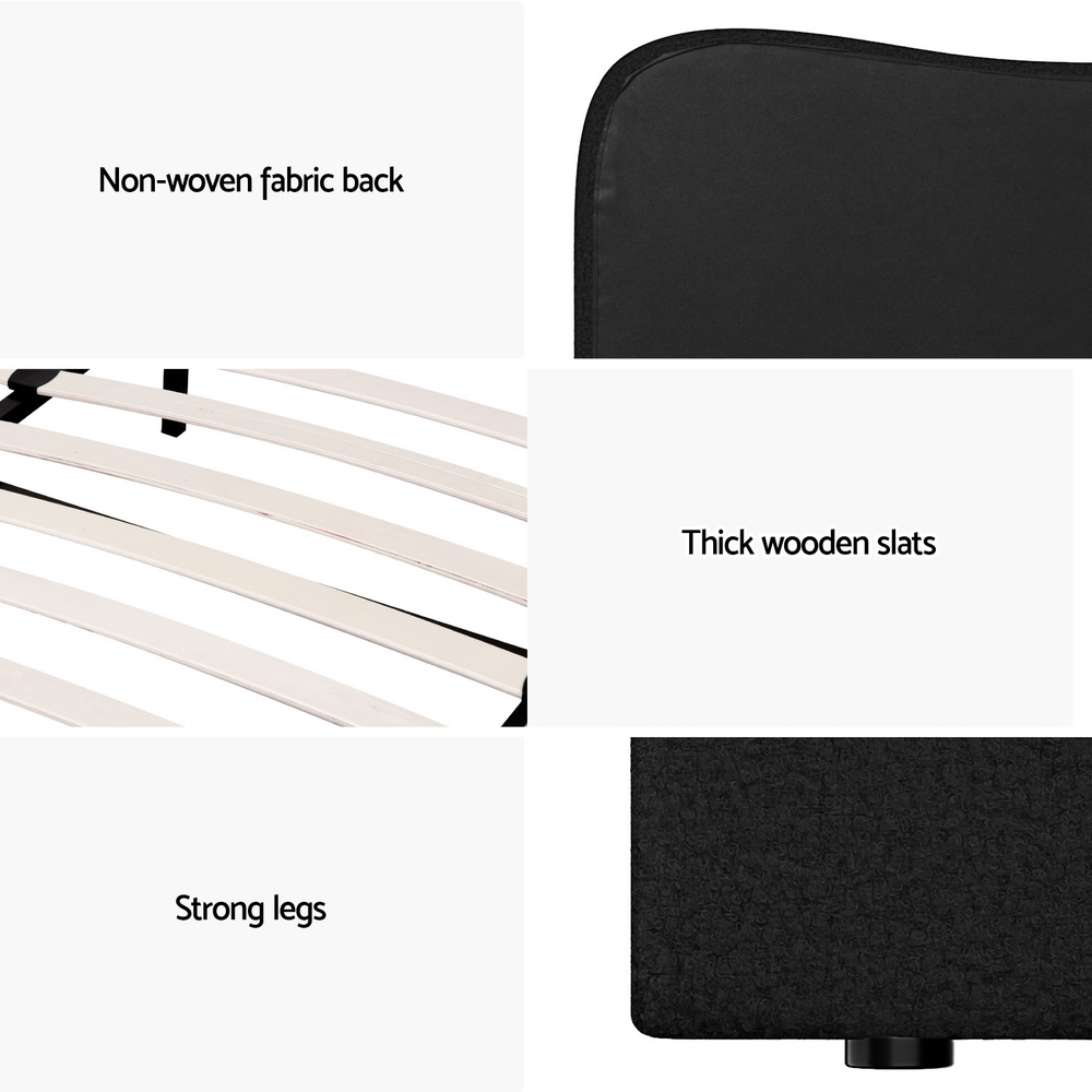 This elegant bed frame features a boucle fabric upholstery and a sturdy wooden frame with slat support. It includes a padded headboard and smooth edge finish, combining style and functionality for your bedroom.