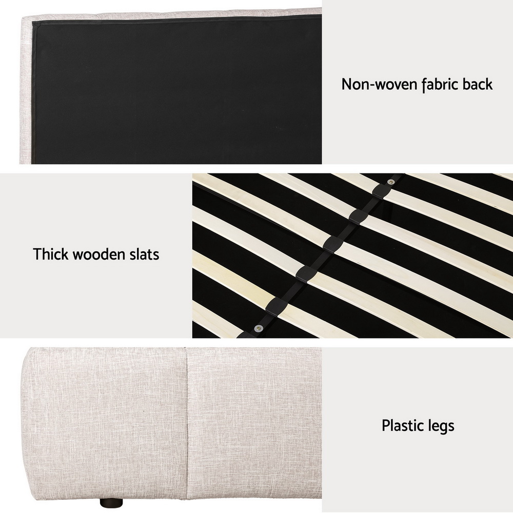 This bed frame offers a combination of style and support, featuring a sturdy wooden construction with slats for stability. Upholstered in a soft beige linen fabric, it provides a comfortable and elegant sleeping environment. Designed for queen-sized mattresses, it combines functionality with a refined appearance to enhance your bedroom decor.