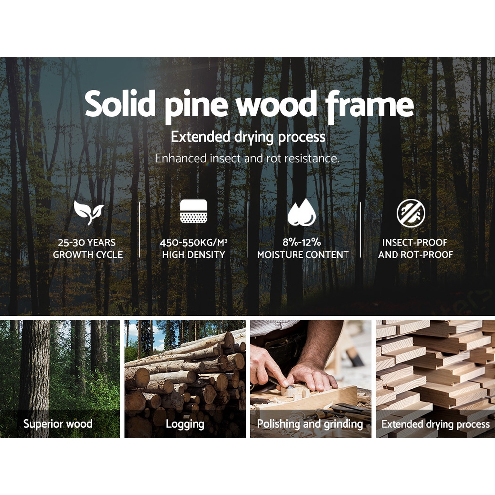 This queen size bed frame features a sleek and elegant design crafted from solid pine wood. It offers a durable, stable, and environmentally friendly construction with a non-toxic finish. The frame includes plywood slats for even weight distribution and to keep the mattress securely in place. Additional support is provided by central support beams, and there is ample storage space underneath, making it suitable for bedrooms with limited space. Designed to fit standard Australian-sized mattresses, this bed frame combines style and functionality for a comfortable sleeping experience.