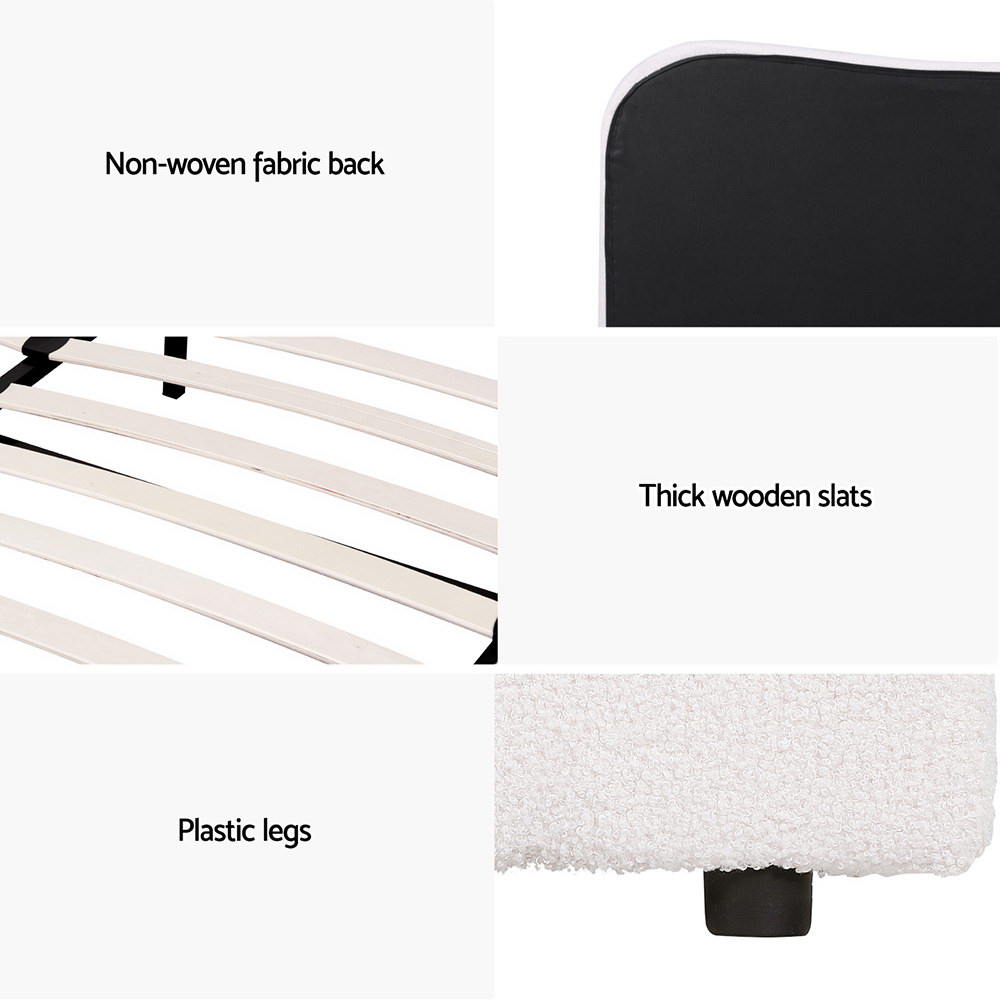 This single size bed frame features a stylish boucle fabric upholstery and a sturdy wooden frame with slat support. It includes a padded headboard and smooth edge finish, combining comfort and modern design for your bedroom.