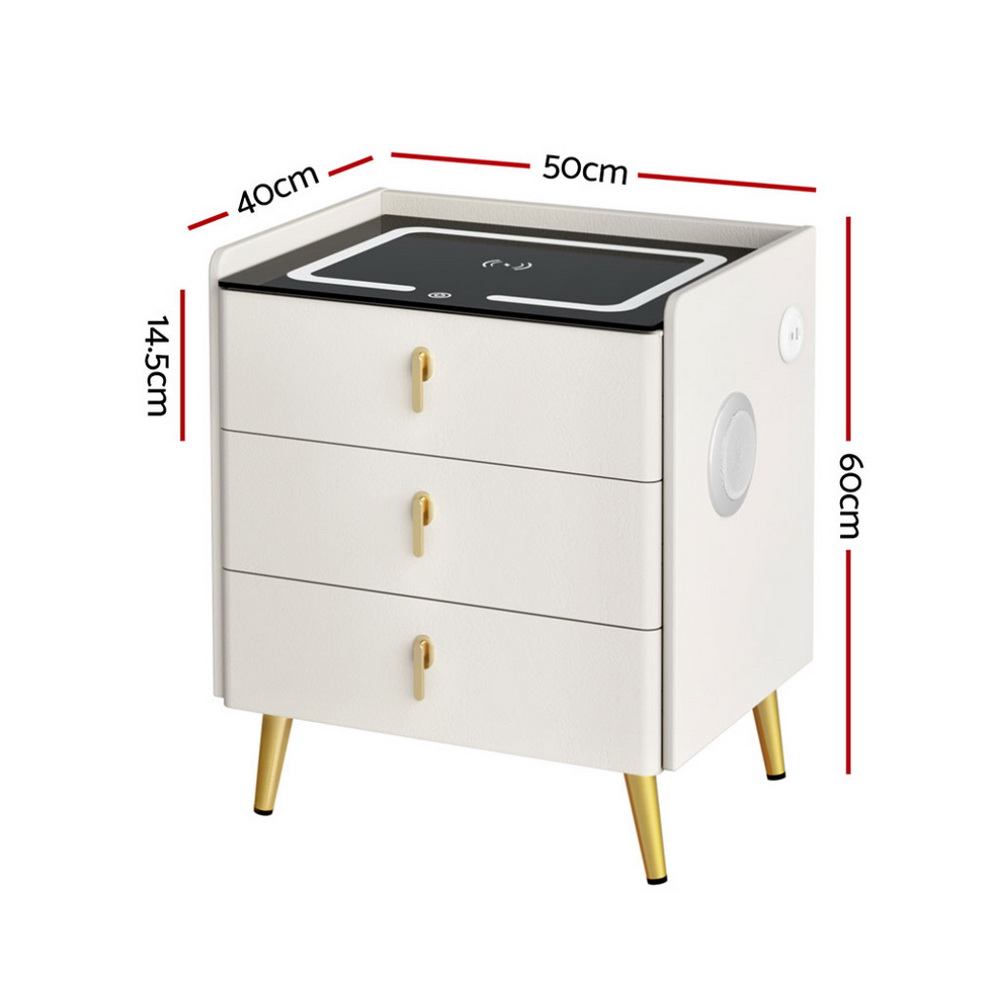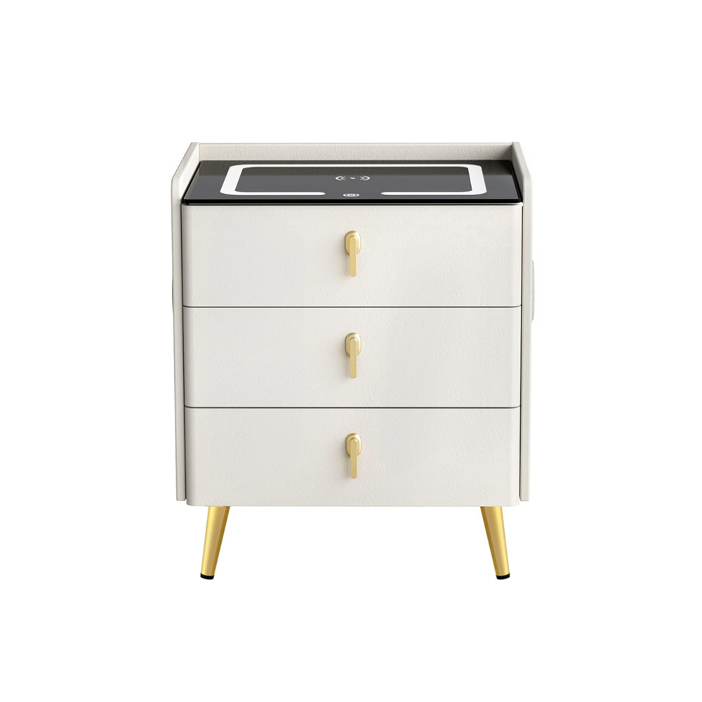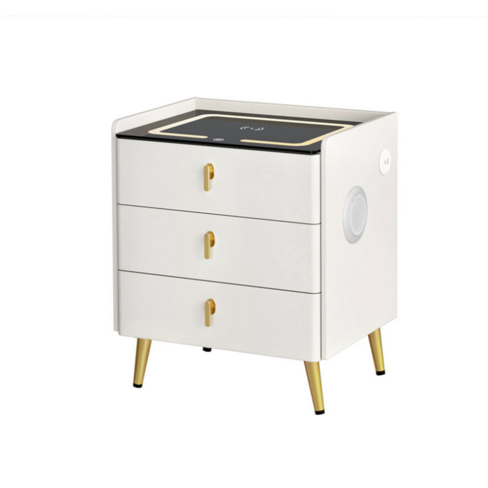 This bedside table combines modern design with multifunctional features to enhance your bedroom space. It offers wireless charging, adjustable LED lighting, Bluetooth speakers, and multiple charging ports, making it a practical addition for a tech-savvy lifestyle. The unit includes spacious drawers for storage and a durable tempered glass tabletop, all supported by sturdy metal legs with floor protectors for stability and ease of maintenance.