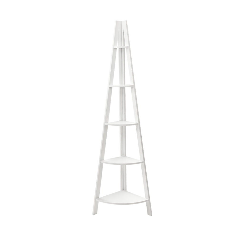 This corner ladder shelf features five tiers with increasing sizes from top to bottom, providing ample space for displaying and storing items. Its creative design maximizes corner space, making it suitable for various rooms. The shelves are crafted with durable MDF and finished with a smooth, eco-friendly, non-toxic paint. The rounded edges enhance safety, and the anti-slip base ensures stability. Its sleek appearance and practical structure make it an attractive and functional addition to any home.