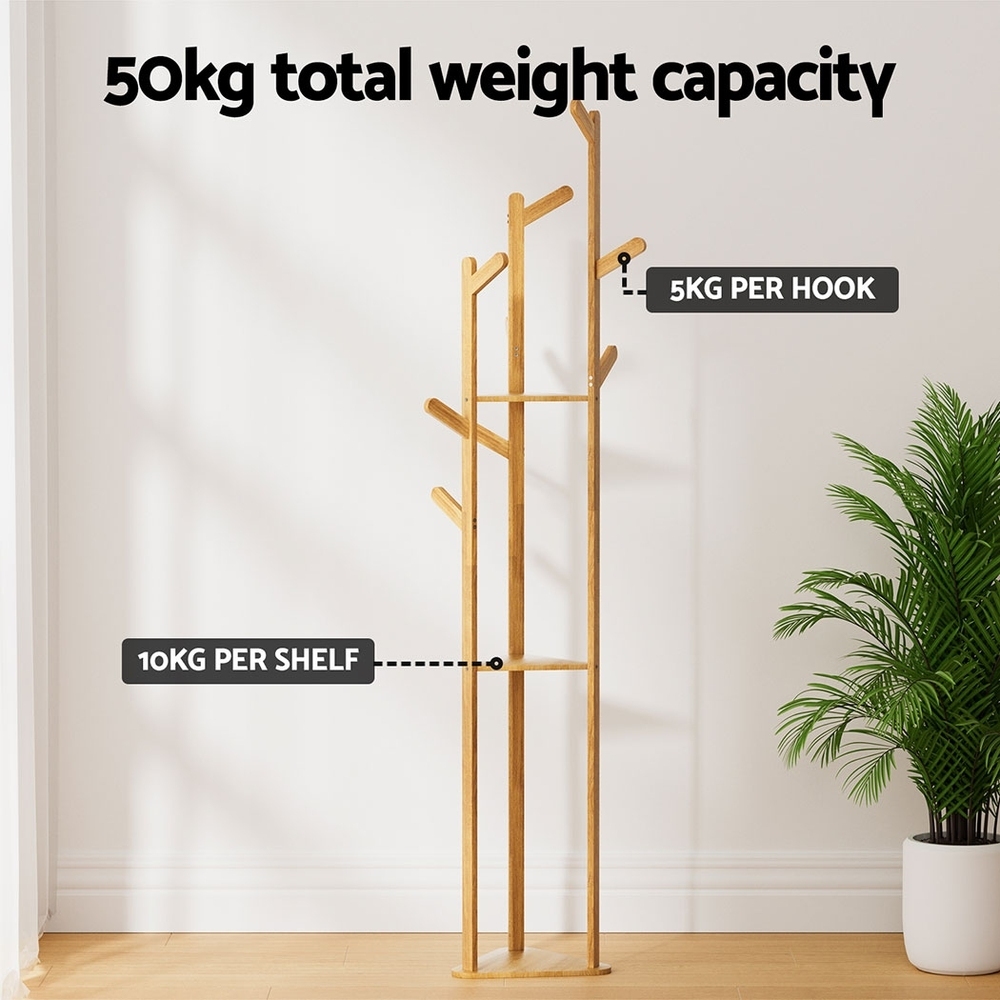 This clothes rack offers a stylish and practical solution for organizing garments. It features a three-tier tree design with multiple hooks, providing ample space for hanging clothes and accessories. Made from durable bamboo with a smooth finish, it combines stability with an elegant appearance. The lightweight construction allows for easy movement and setup, making it suitable for various room sizes and styles. Easy to clean and assemble, this garment rack helps keep your space tidy and organized.