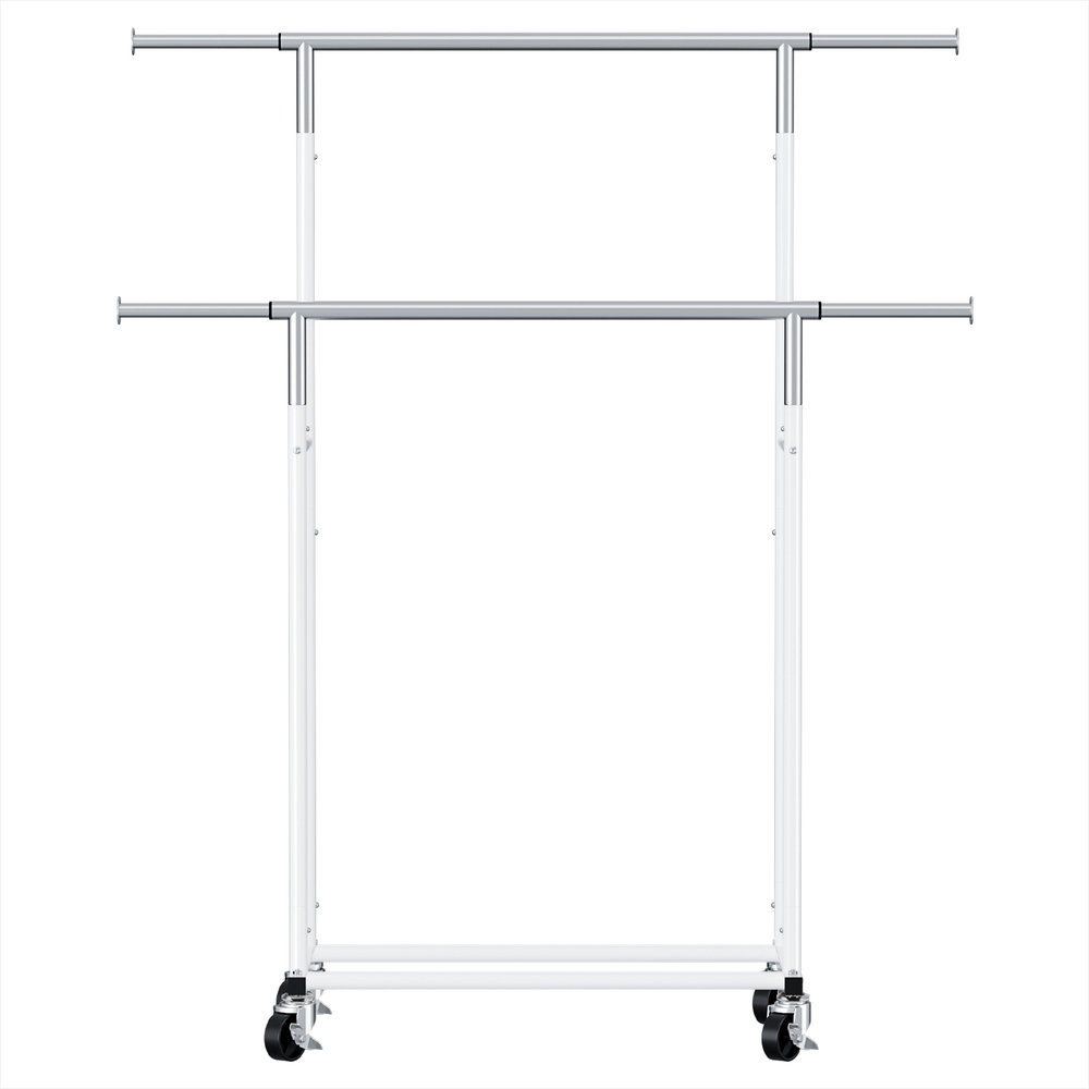 This heavy-duty clothes rack features a double extendable horizontal rod and a sturdy metal construction, providing versatile storage for various clothing items. Its corrosion-resistant finish and smooth surface ensure durability and ease of use. Equipped with swivel casters, including lockable wheels, it offers mobility and stability, making it suitable for home, retail, or rental spaces. The rack can be collapsed vertically for convenient storage when not in use.